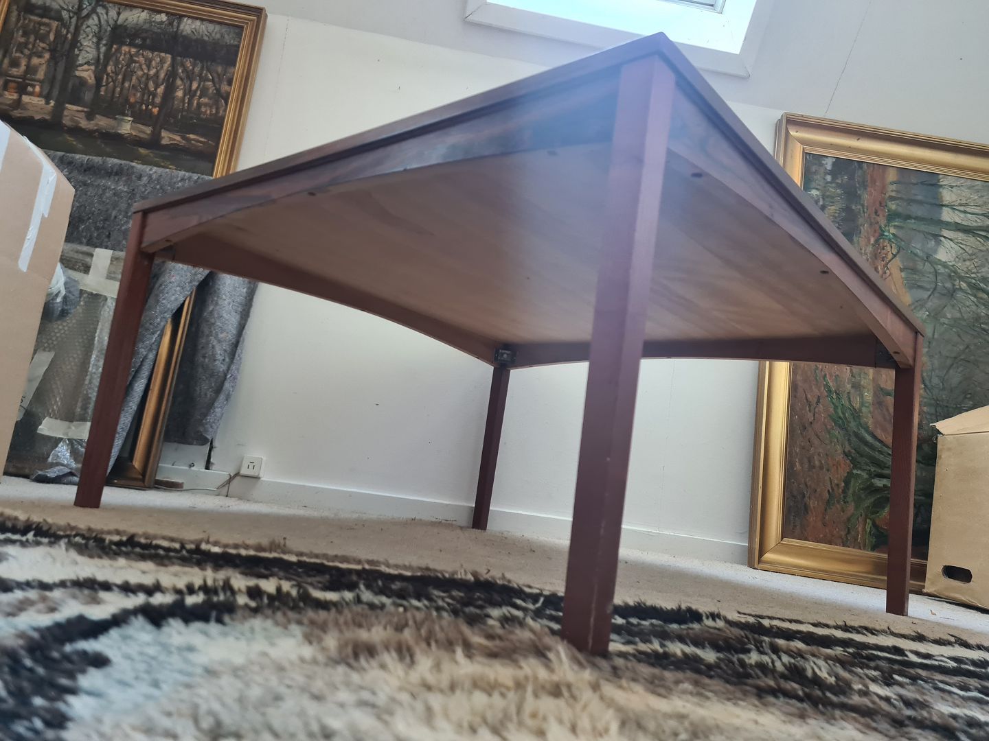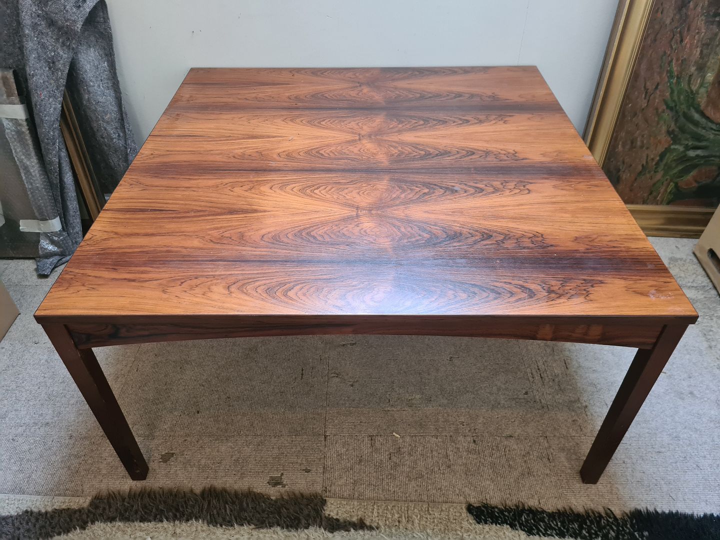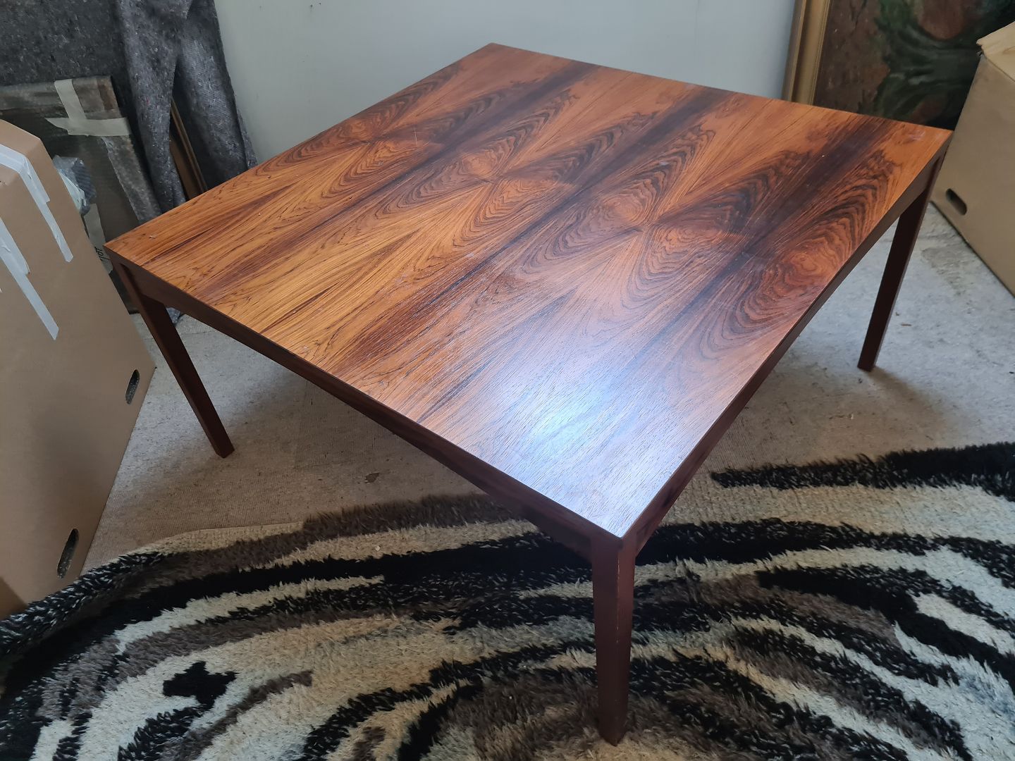 Dansk Design kvadratisk sofabord fra 1970'erne i palisanderfinér. Fremstår pænt og velholdt uden de store brugsspor.