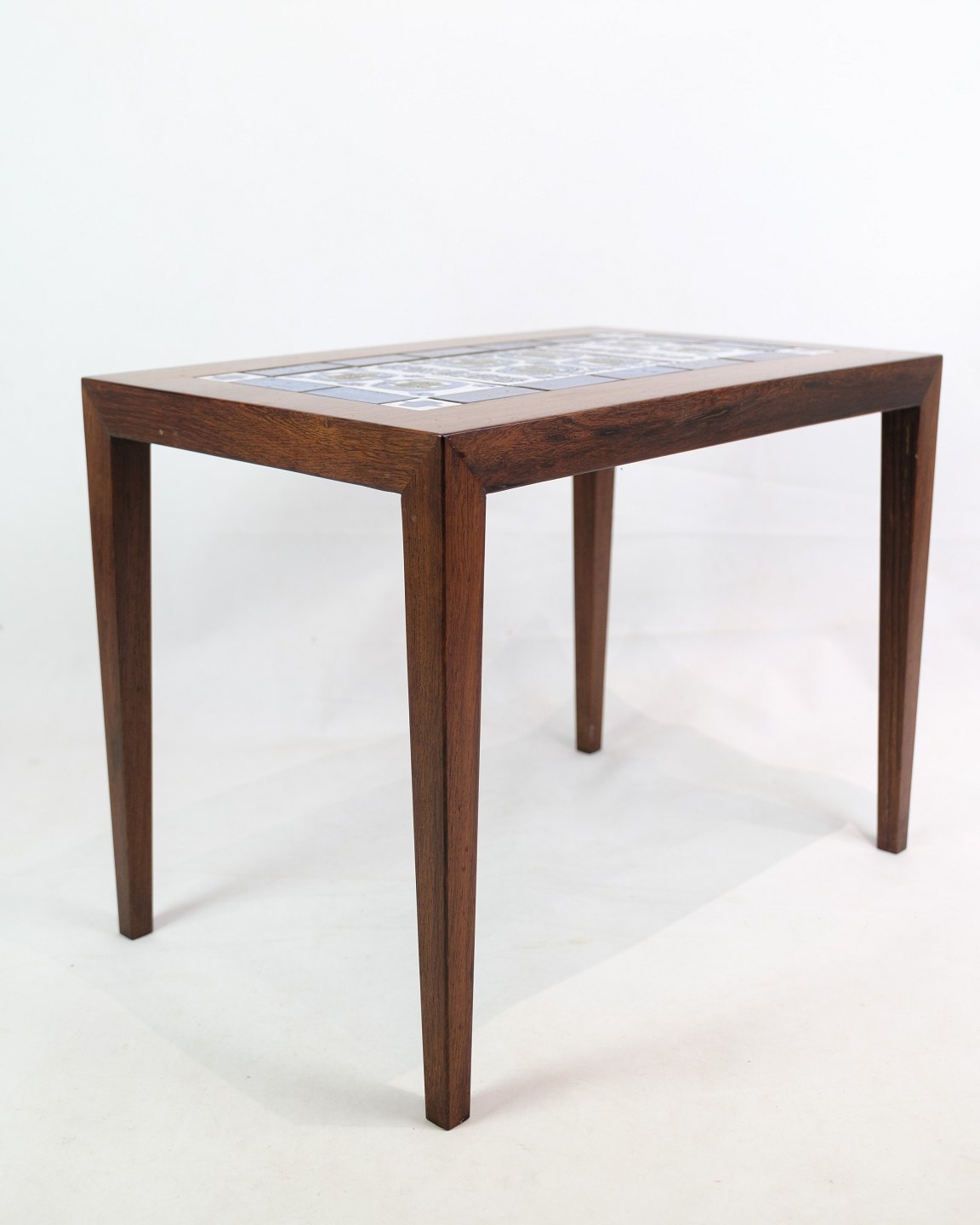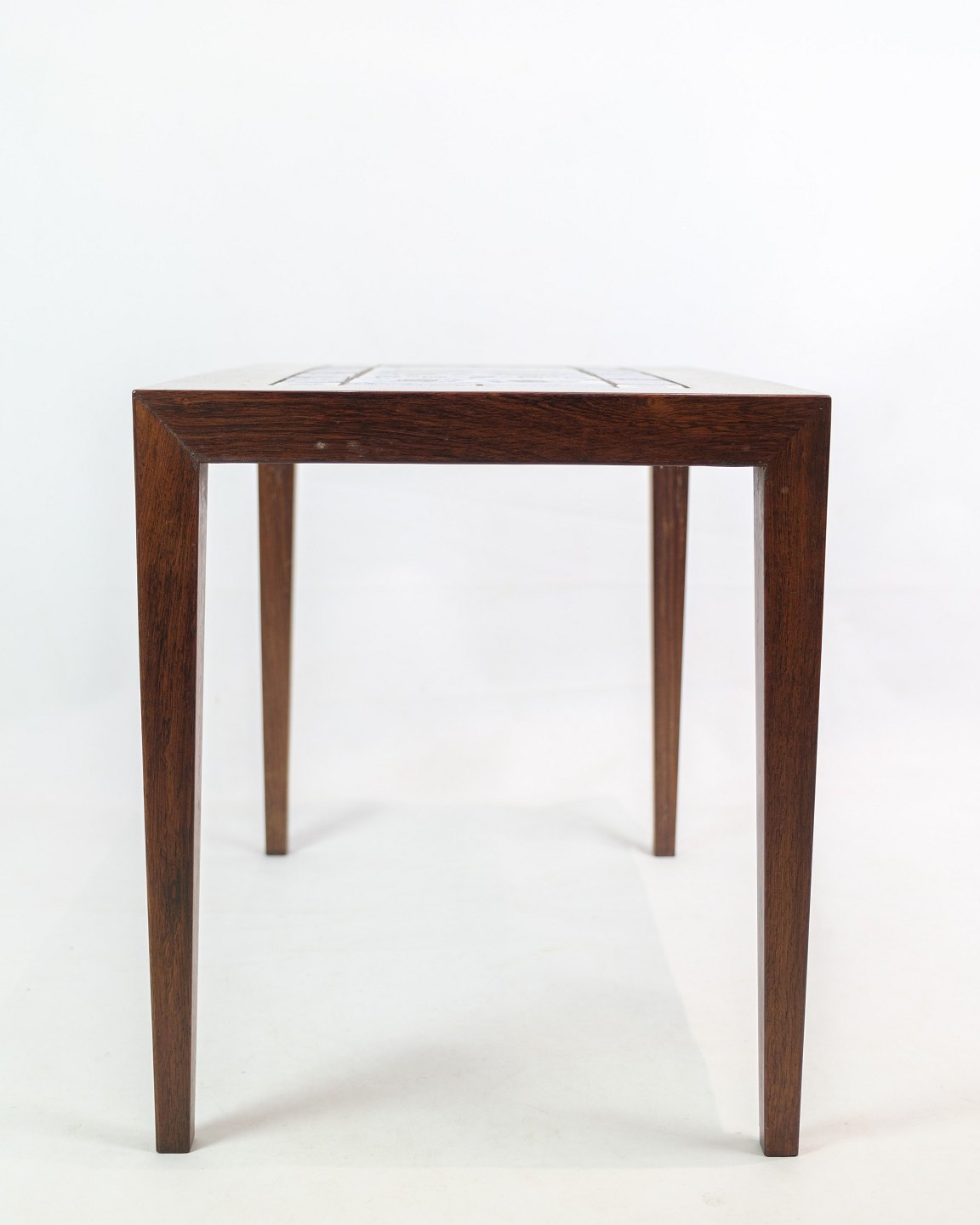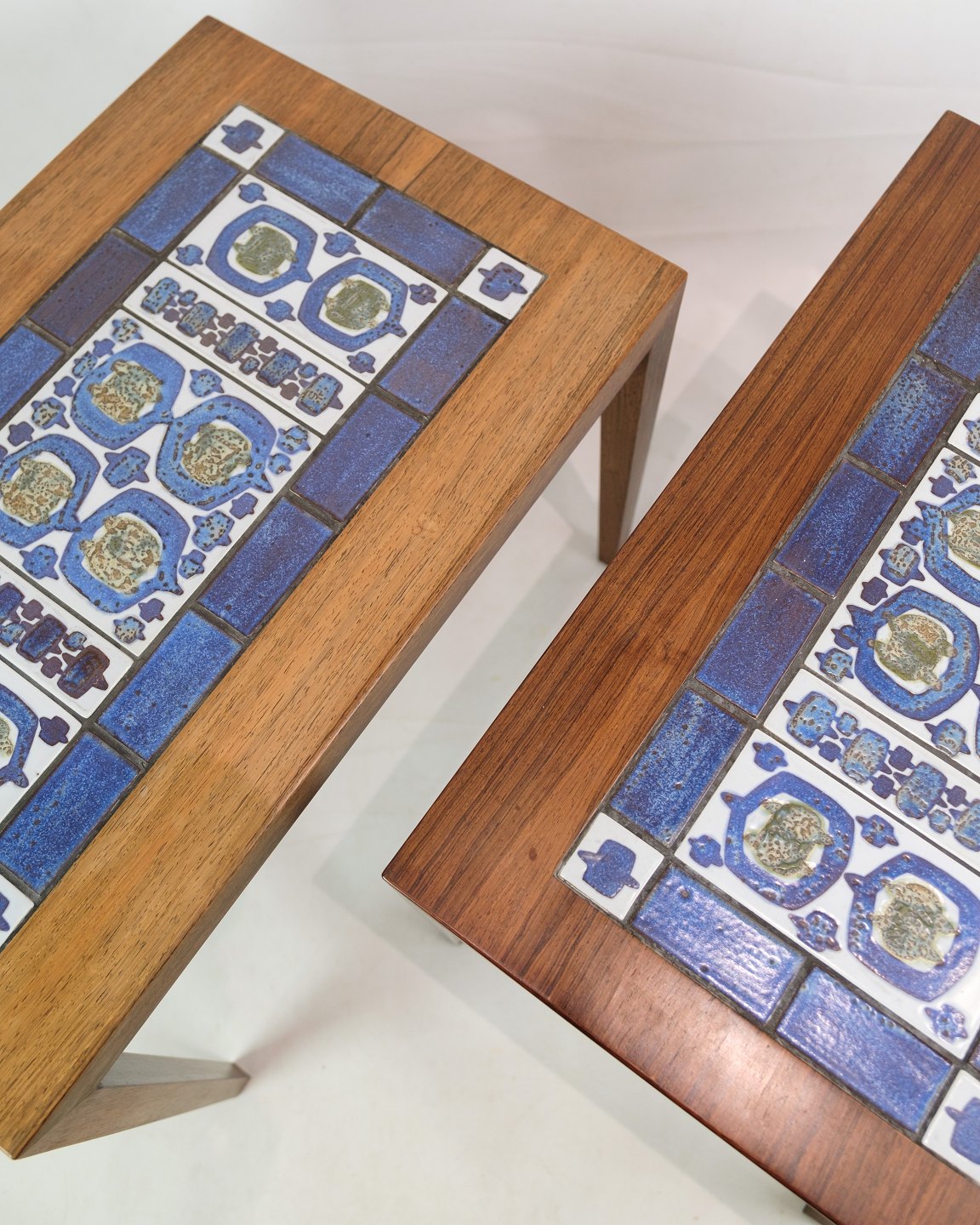 Sæt af sideborde, model 34A, i palisander designet af Severin Hansen med fliser fra Den Kongelige Porcelænsfabrik, produceret omkring 1960'erne. Disse sideborde repræsenterer en smuk kombination af kvalitetsmaterialer og dansk designarv. Palisandertræet giver en varm og luksuriøs fornemmelse, mens fliserne fra Den Kongelige Porcelænsfabrik tilføjer et strejf af elegance. Dette møbel er ikke blot funktionelt, men også et tidstypisk kunstværk, der udtrykker designet fra den æra. Et enestående samlerobjekt for dem, der værdsætter vintage møbelkunst og dansk designhistorie.