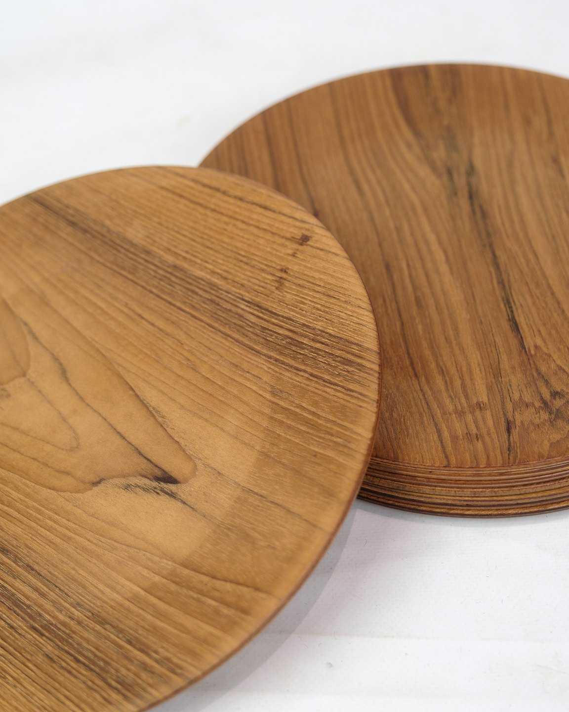 Hver tallerken er formet af teaktræets naturlige skønhed, der bringer varme toner og en distinkt kornstruktur. Denne æra var præget af en forkærlighed for enkelhed og funktionalitet, og disse tallerkner repræsenterer den tidløse elegance, der kendetegner midt-århundredes design.