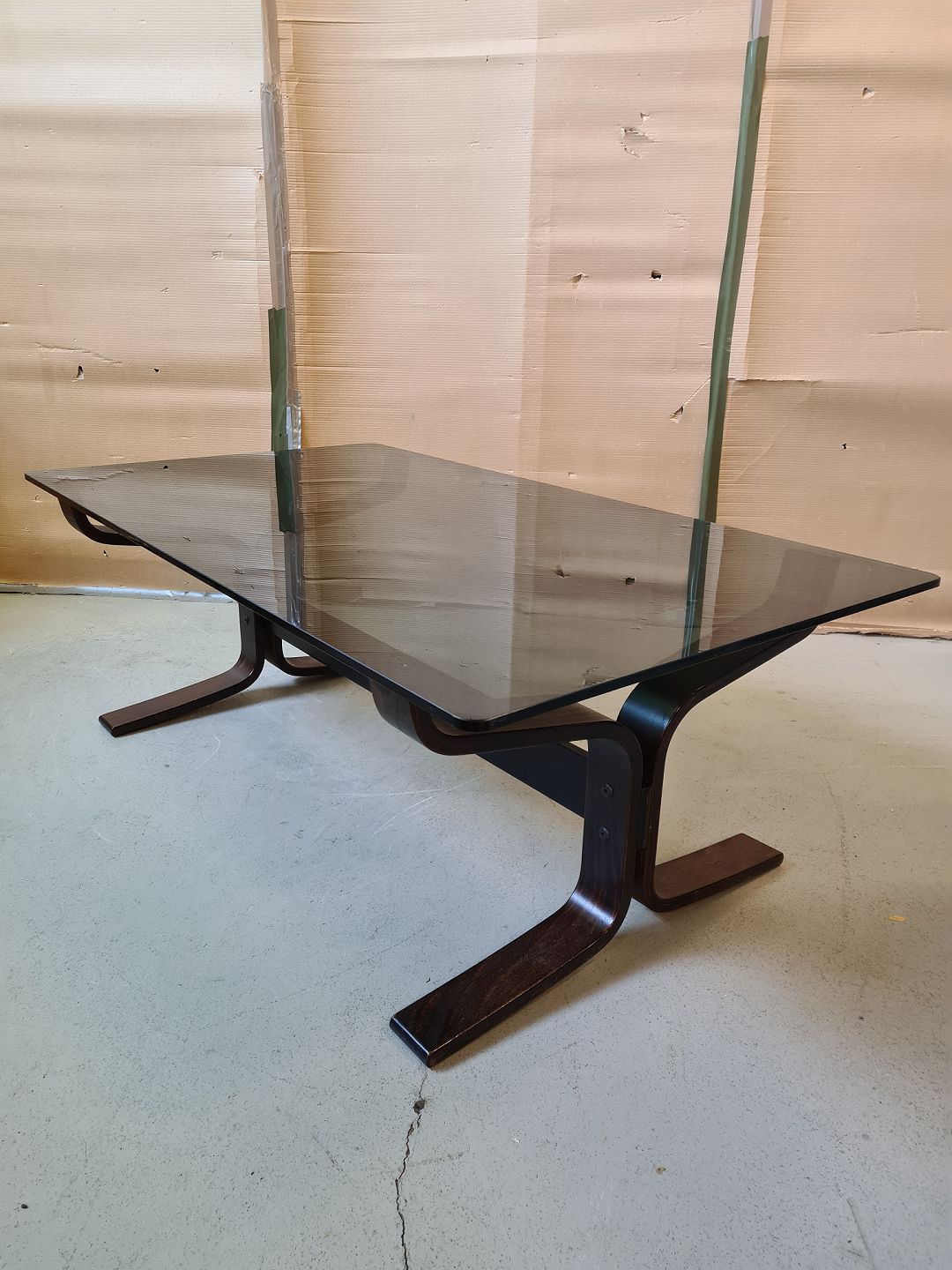 Sofabord i bejdset bøgetræ med glasplade, fra 1990erne.