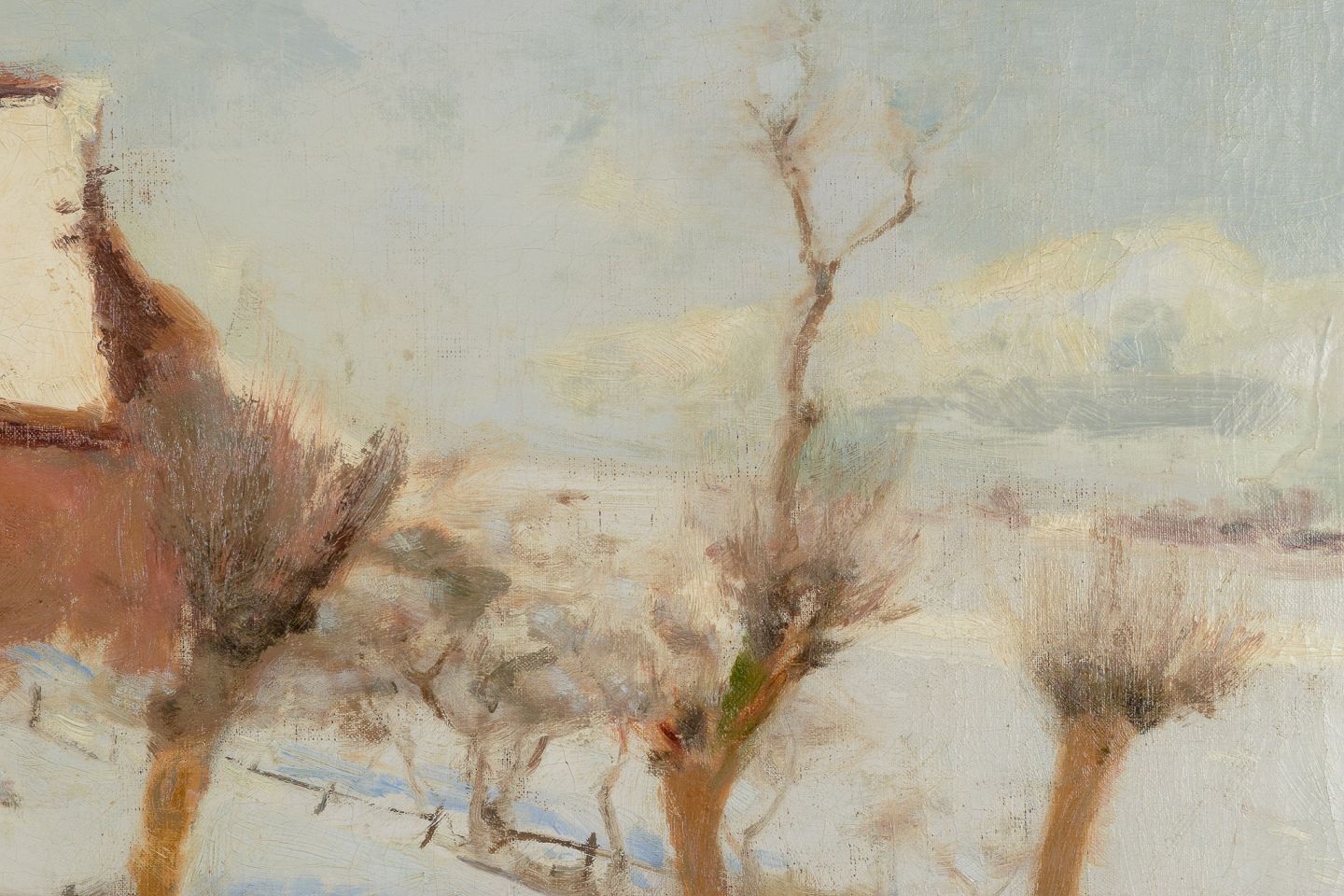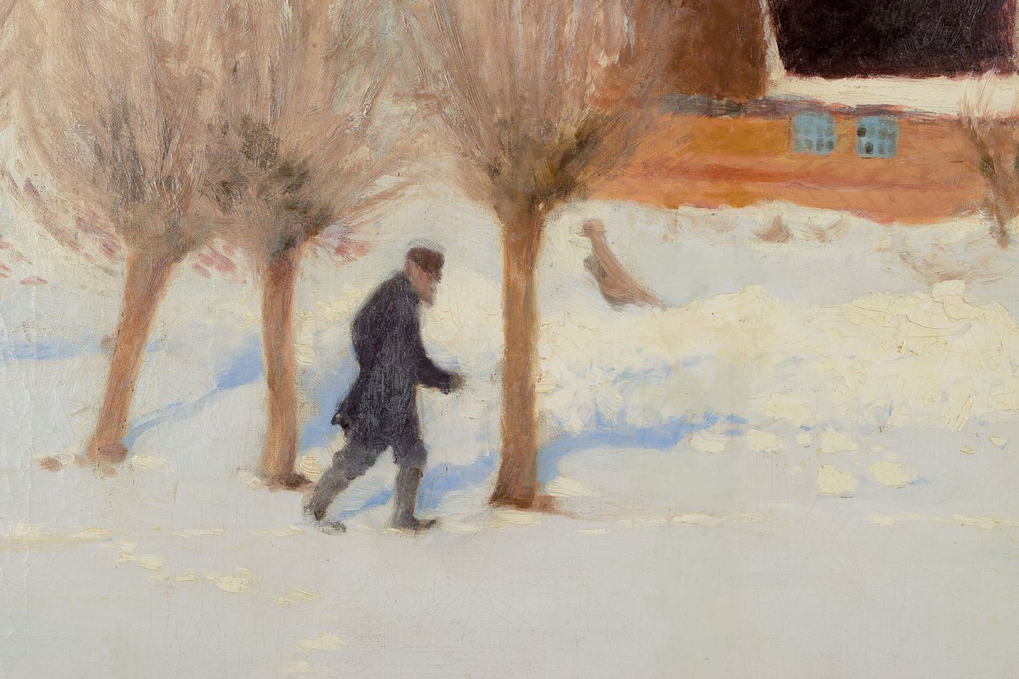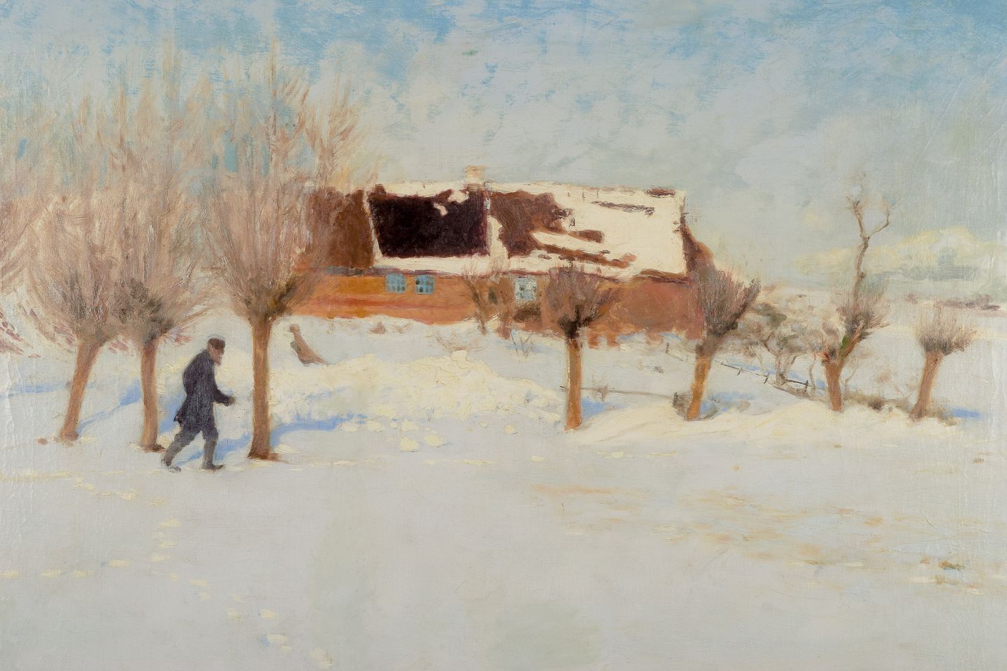 Vinterlandskab med gård i baggrunden og gående mand i sneen.