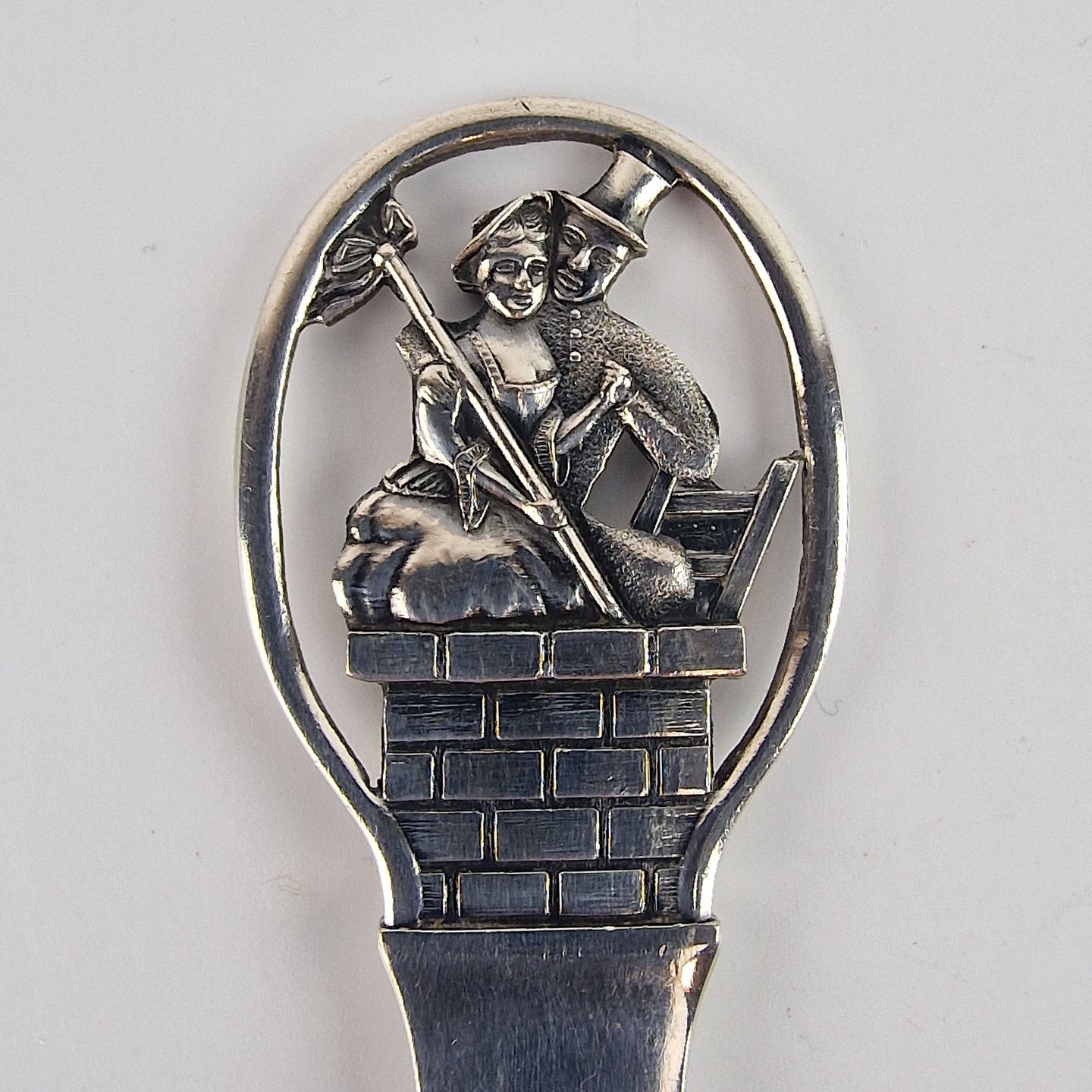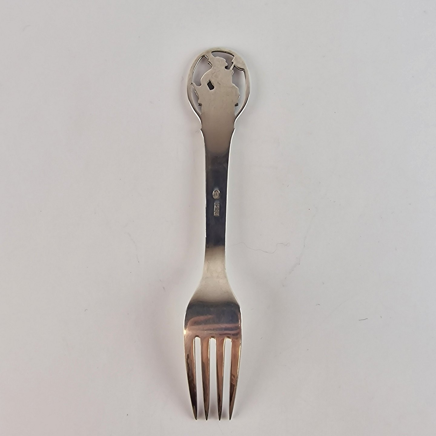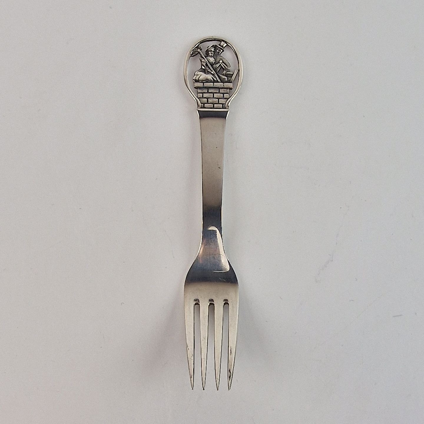Børnegaffel i tretårnet sølv med motiv fra H. C. Andersen eventyret Hyrdinden og skorstensfejeren
