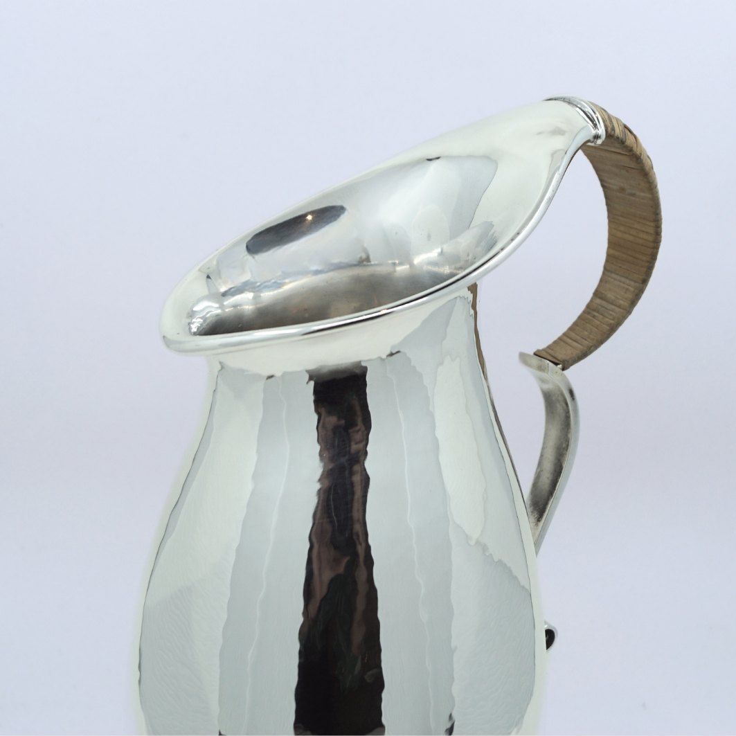 Karl Gustav Hansen for Hans Hansen. Pitcher of lightly hammered sterling silver, half of the handle with cane. From 1933.
