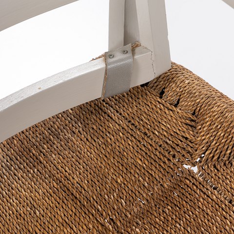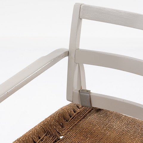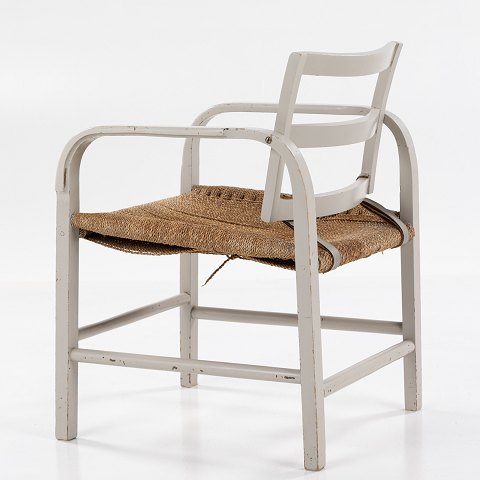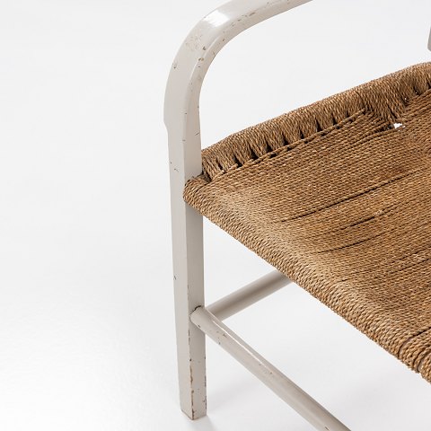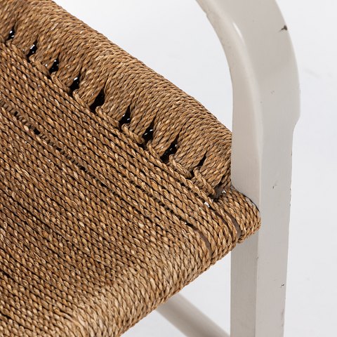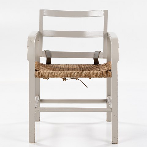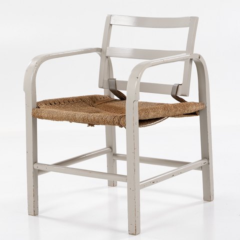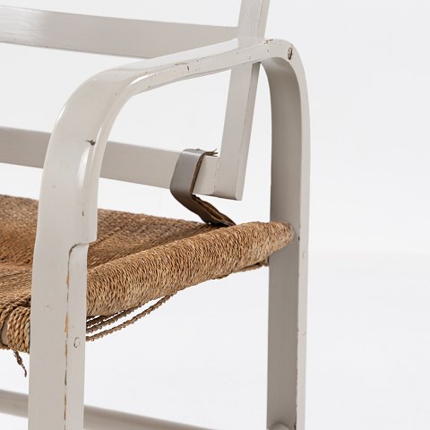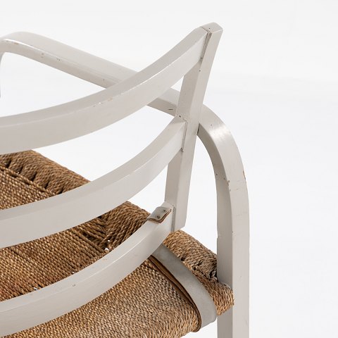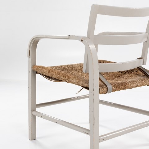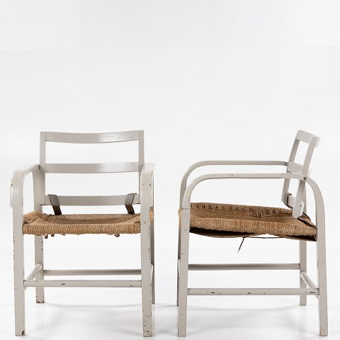 Pair of easy chairs in grey painted wood with patinated seat of paper yarn and back with tilt function. Ca. 1933.