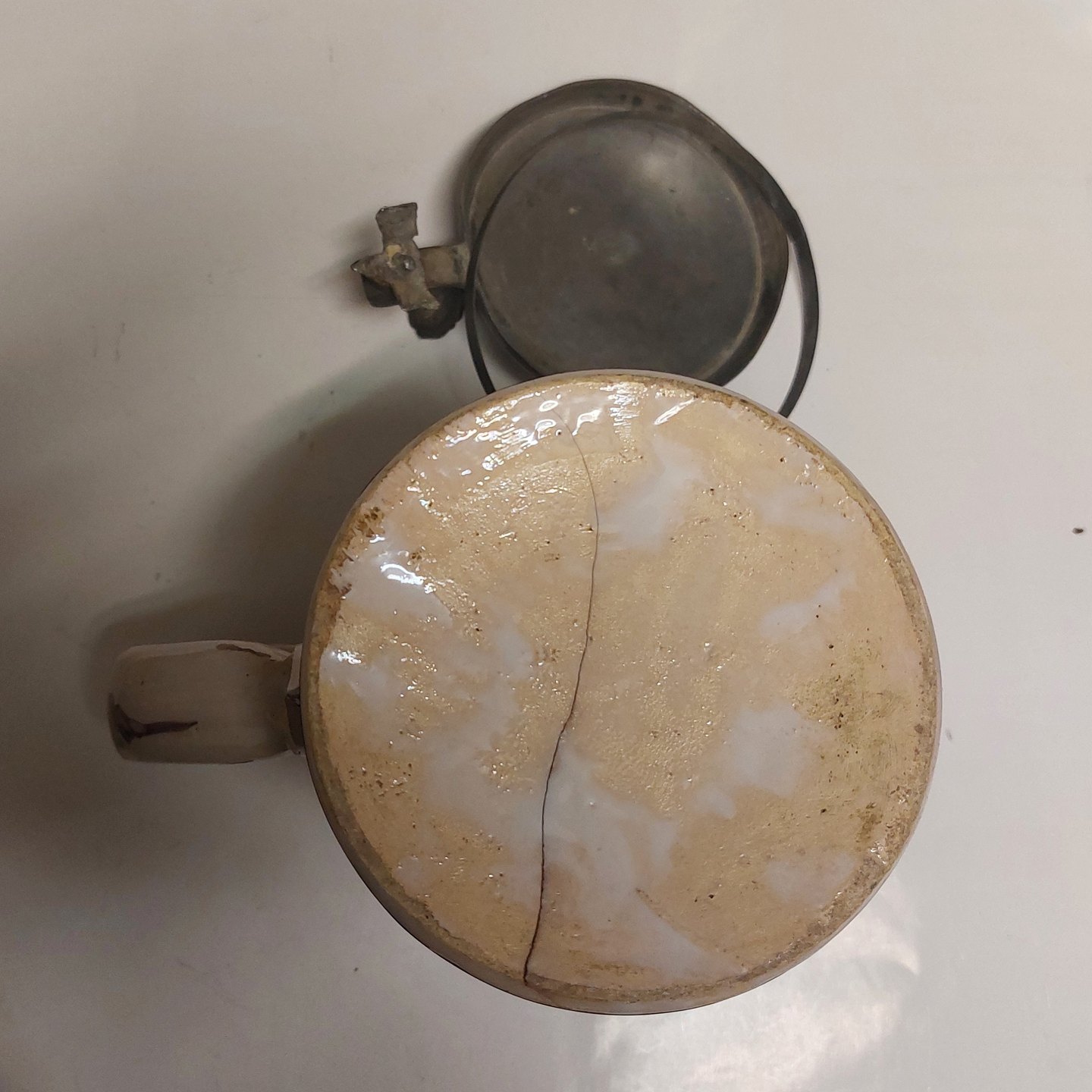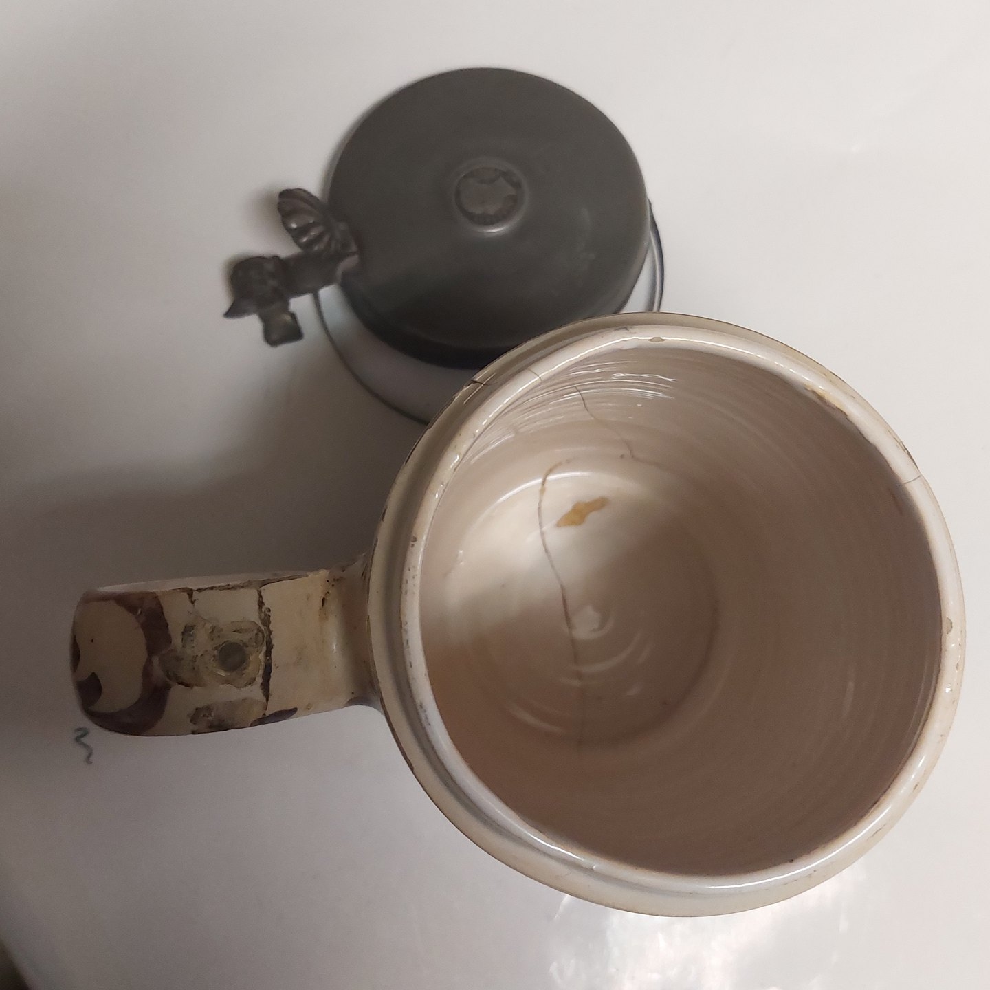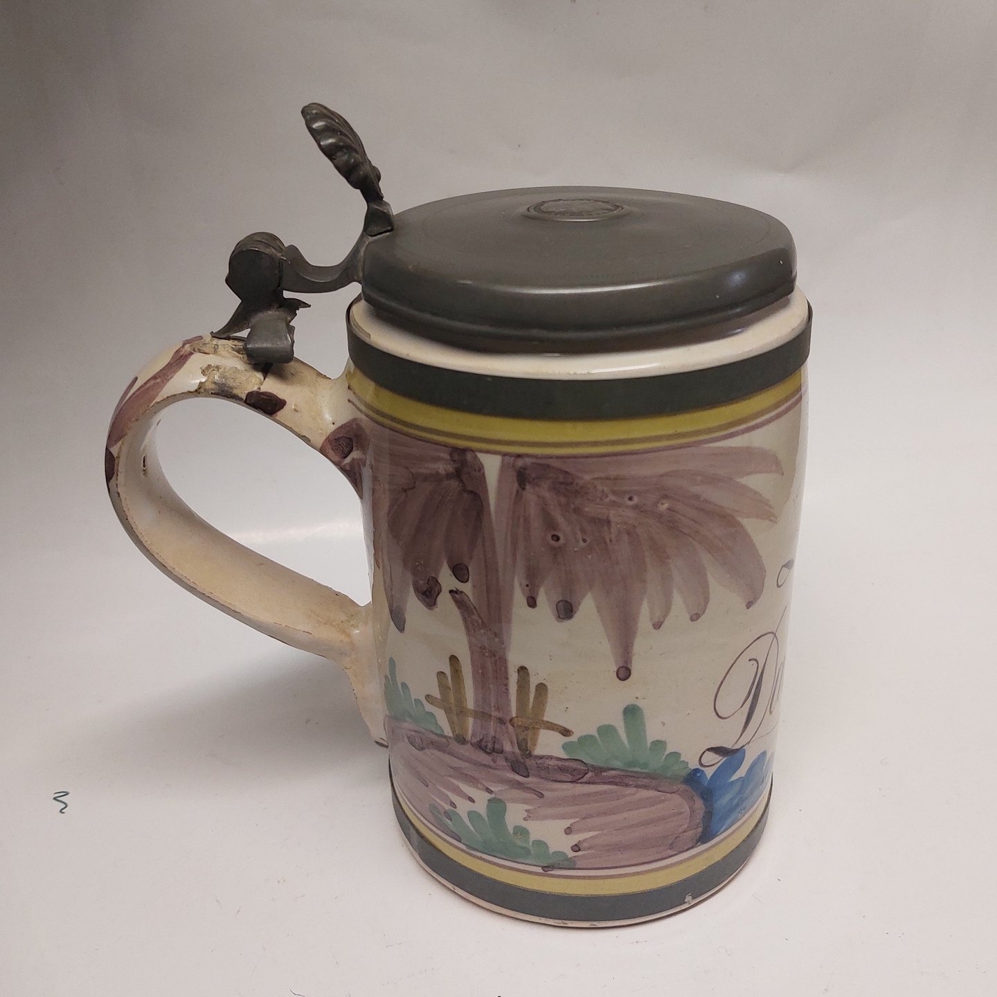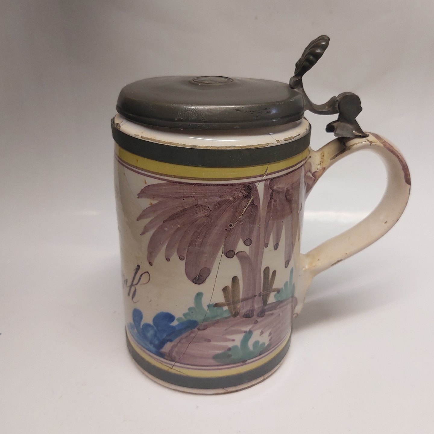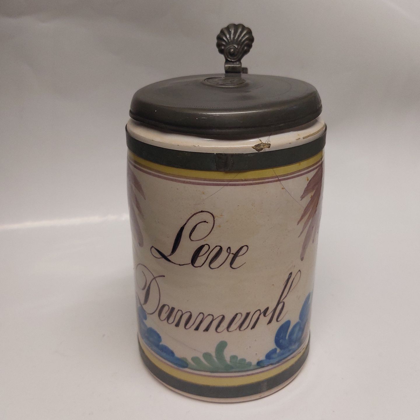 German mug: Hanover-Münten krus med "Leve Danmark" fra omkring 1800 -DEFEKT. Som det fremgår af fotos er kruset defekt. Låget tillige med defekter. H. 20 cm incl. låget