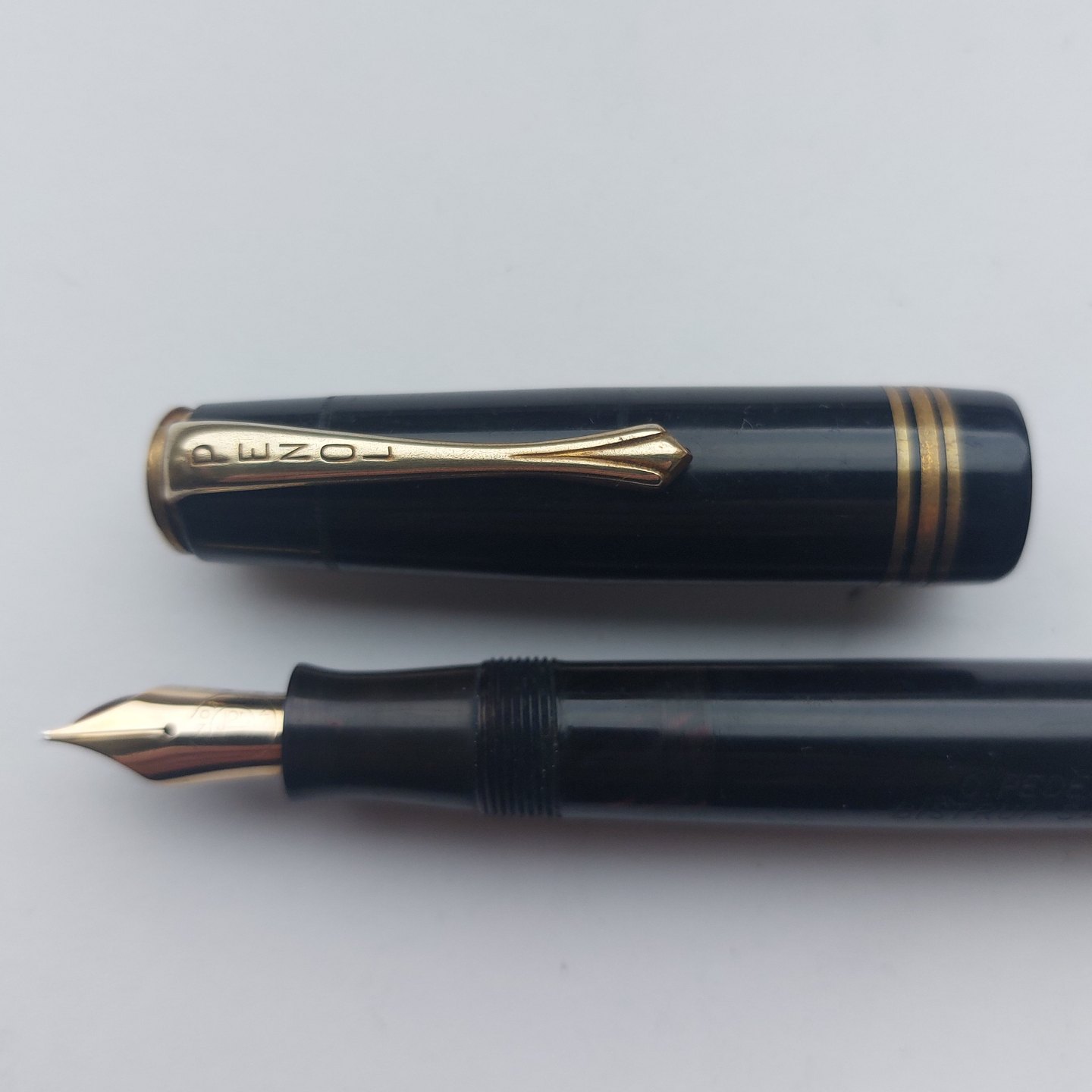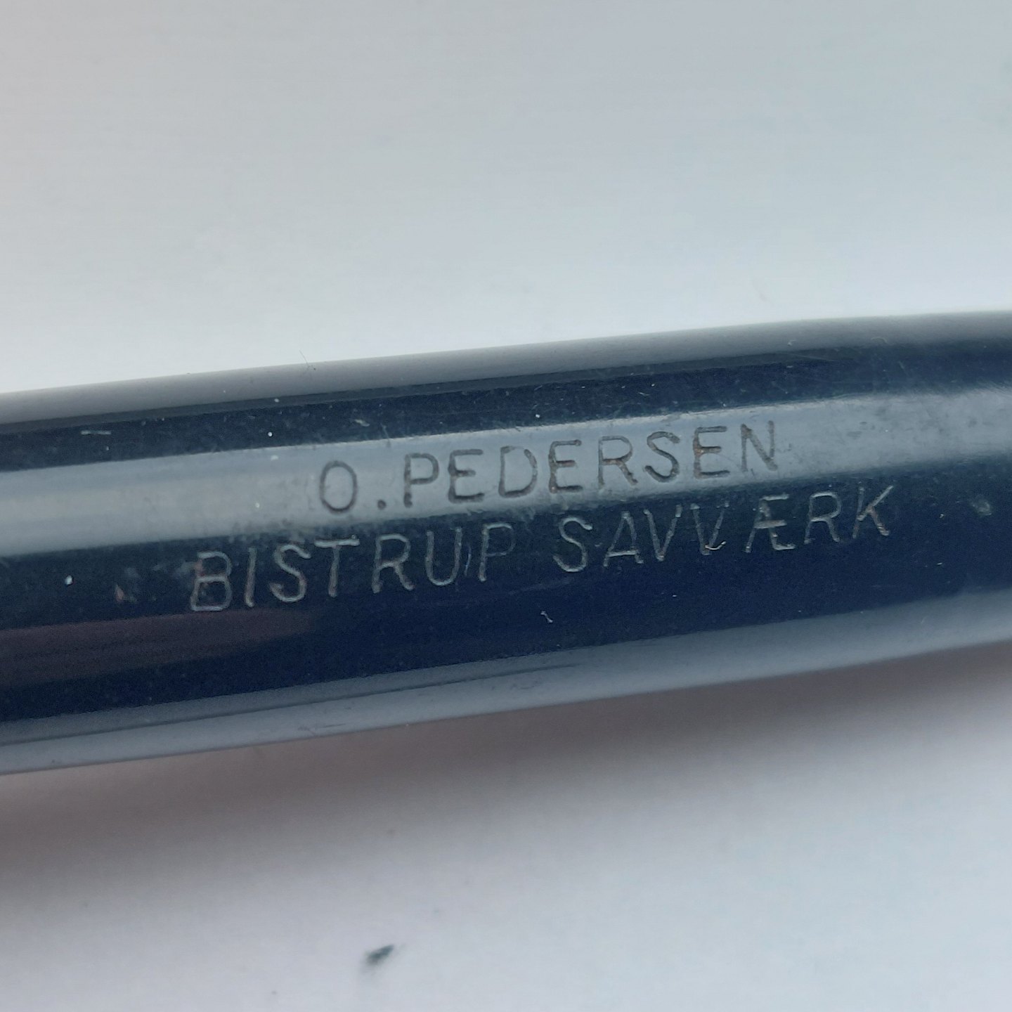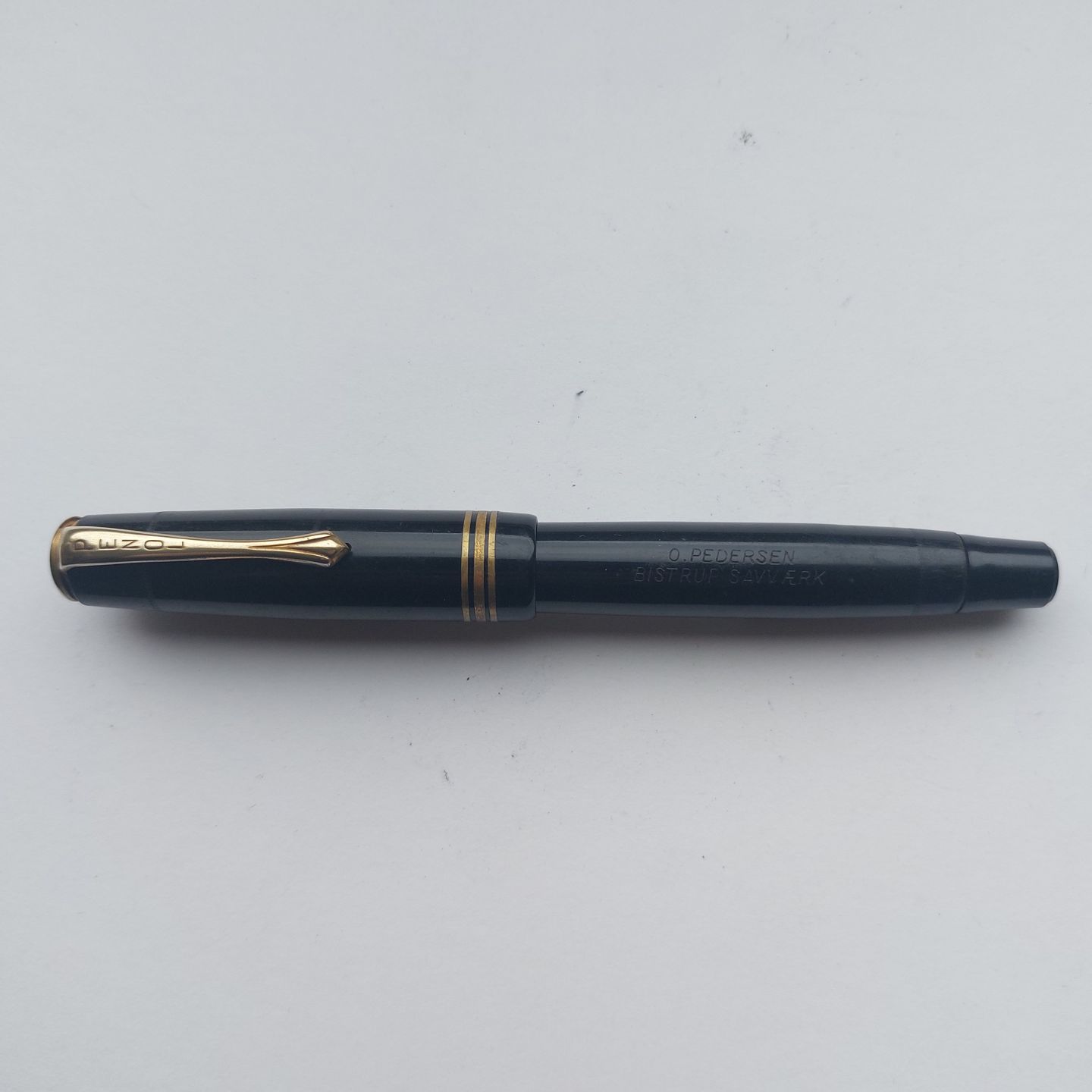 Stor cigar: Sort Penol Ambassador Senior fyldepen. Push button blækpåfylder. Virker ikke. Der skal indsættes ny gummisæk før end den igen kan optage blæk og skrive igen. Indgraveret både personligt og firma navn. Alle dele originale Penol dele. Toppen med clippen sidder fast, men lidt skævt. Der kan indsættes ny gummisæk for kr. 250,- fyldepennen er 13,5 cm lang.