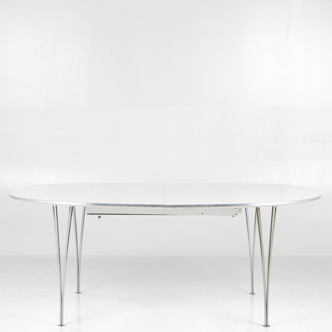 Superellipsebord i hvid laminat med spændben af stål.