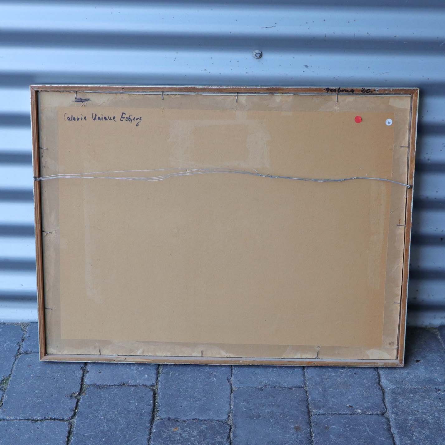 Text available in Danish: Indrammet pasteltegning med passepartout i sølvmalet ramme. Naturtegning fra år 2010 i blå pastel med motiv af to galopperende heste