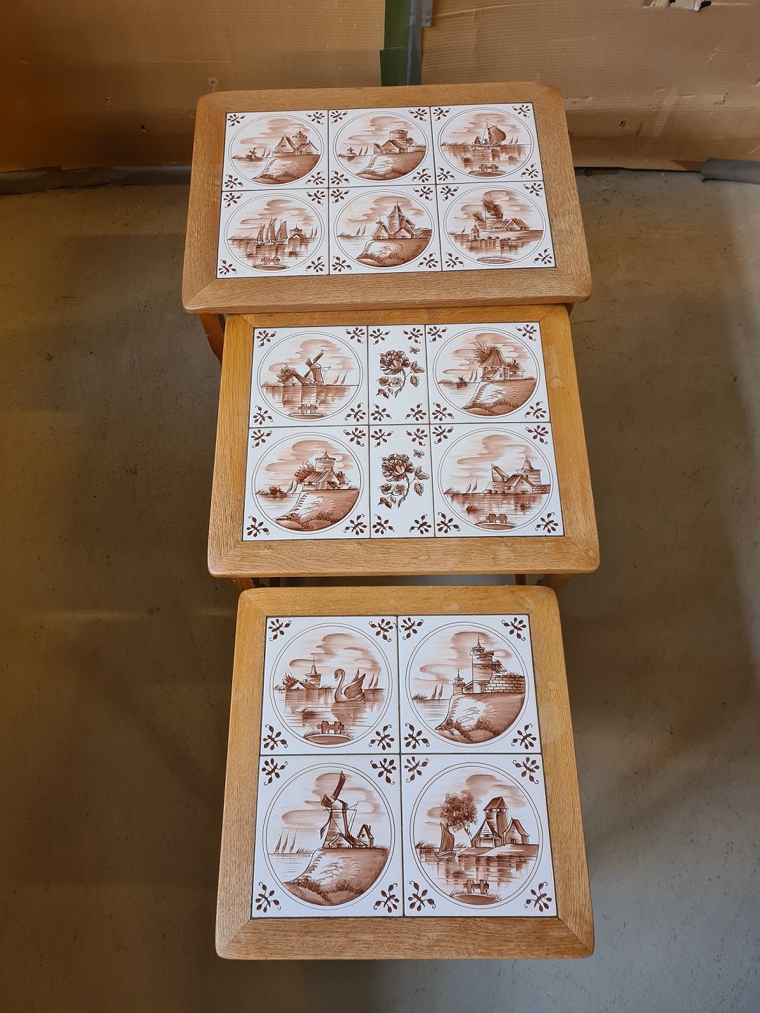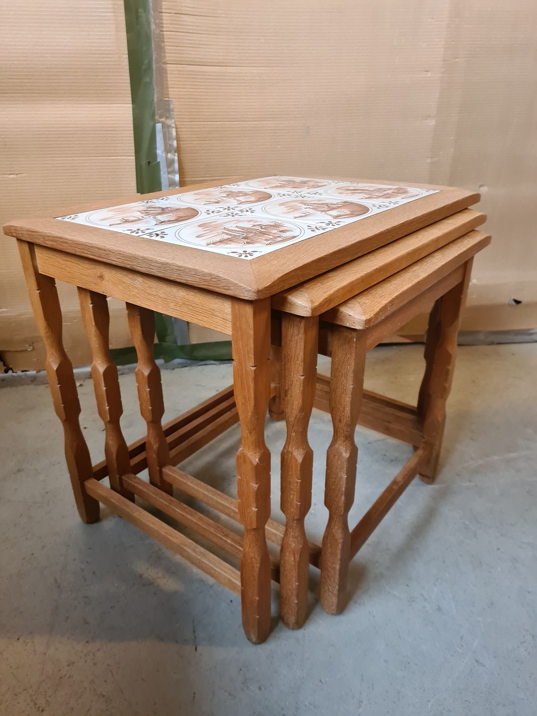 3 Indskudsborde i egetræ med kakler, fra 1980erne.
