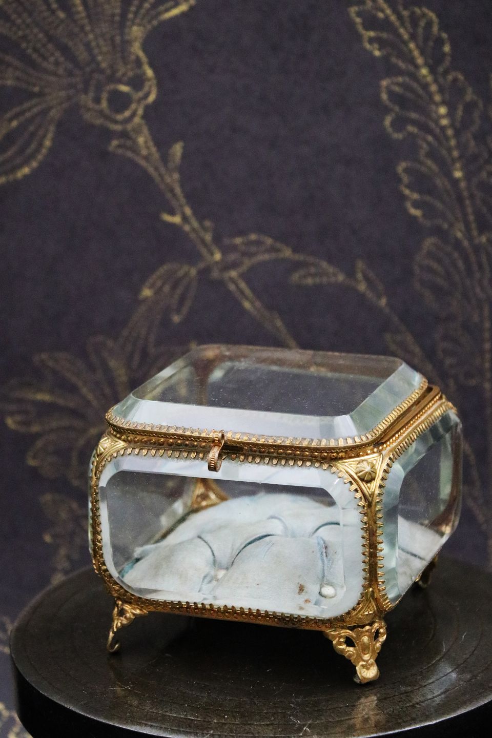Antikt Fransk smykkeskrin i bronze og facetslebne glas og silkepude i bunden med en fin gammel patina...