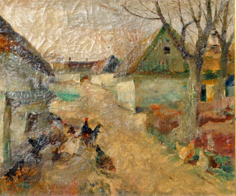 Jacobsen, Ludvig (1890 - 1957) Denmark: Chickens at the farm. 1923. Oil on canvas. Signed "Ludvig Jacobsen 23". 49 x 58 cm.