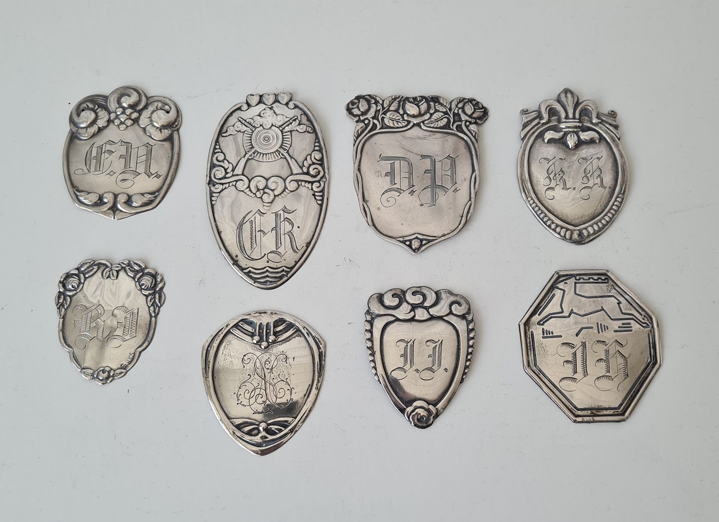 Lot of 8 coat shields in silver