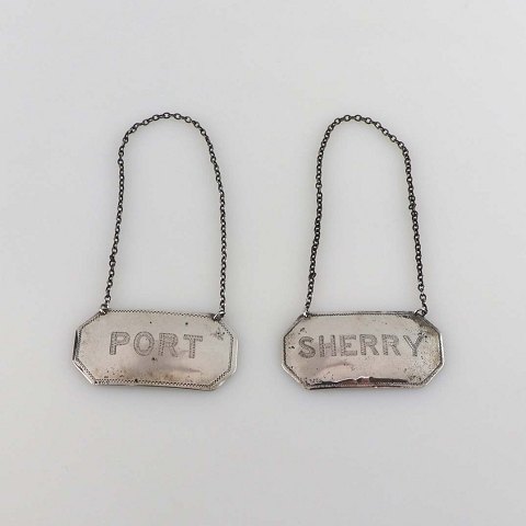 Et sæt flaskeplaketter i sølv til Portvin og Sherry. Begger er stemplet 830s