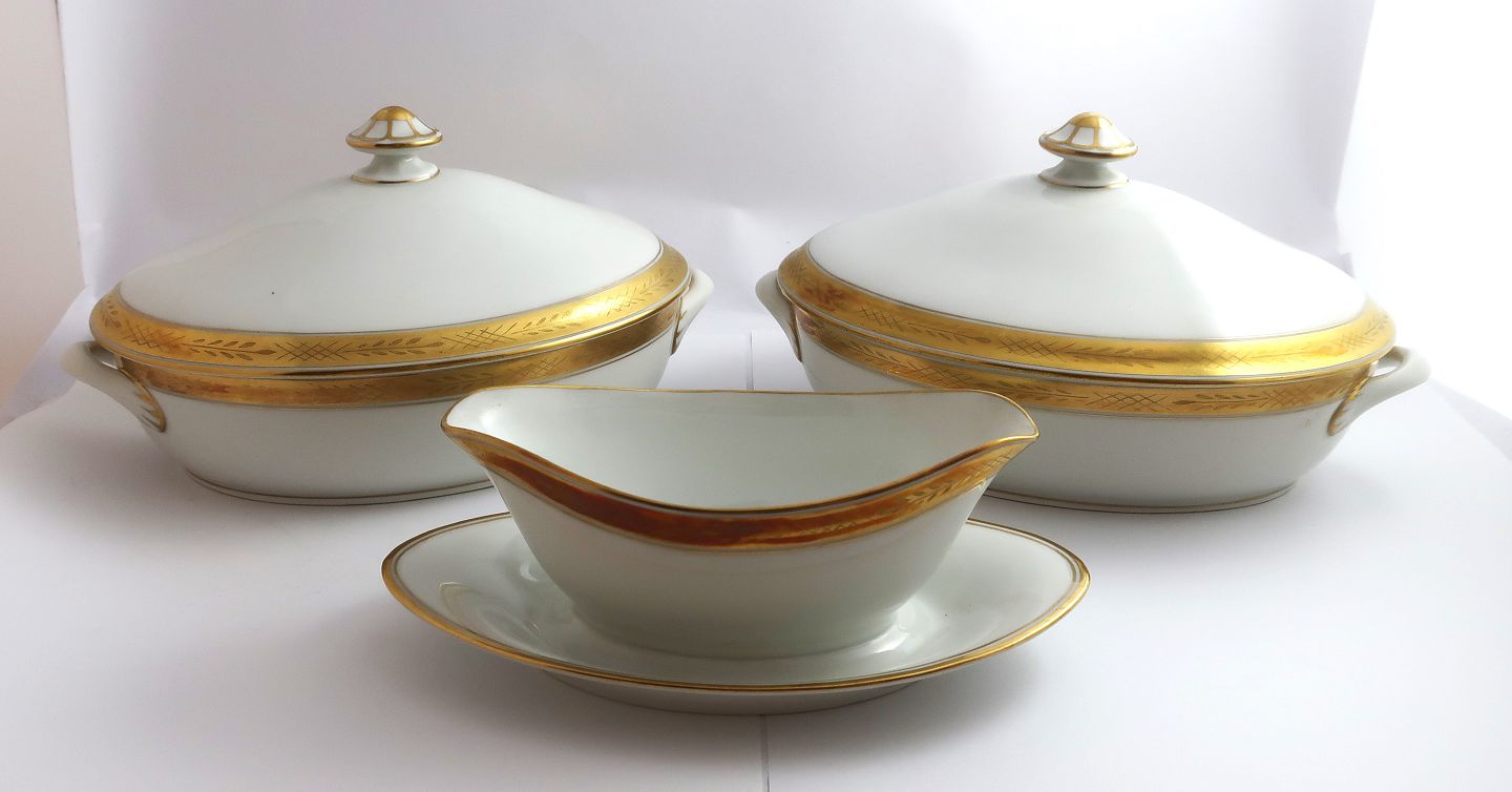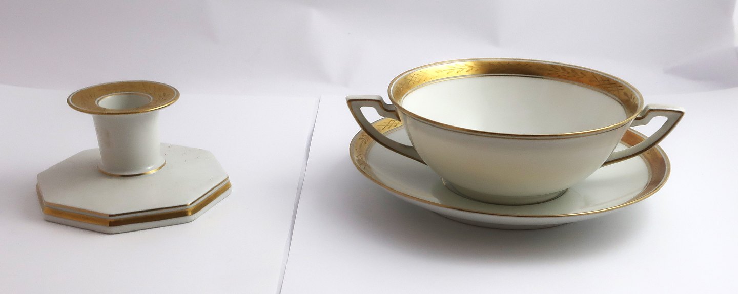 Royal Copenhagen. Porcelænsstel no. 607. Der er til 12 personer. Bestående af 12 middagstallerkner, 12 frokosttallerkner, 12 brødtallerkner, 12 suppetallerkner, 12 bouillonkopper, 4 lysestager, 2 lågfade, 1 terrin, 1 rundt fad, 2 ovale fade, 2 sovseskåle, 1 rund skål, 4 asieter. Ialt 77 dele. (1 sortering). Forsendelses udgift afhængig hvor det skal hen !