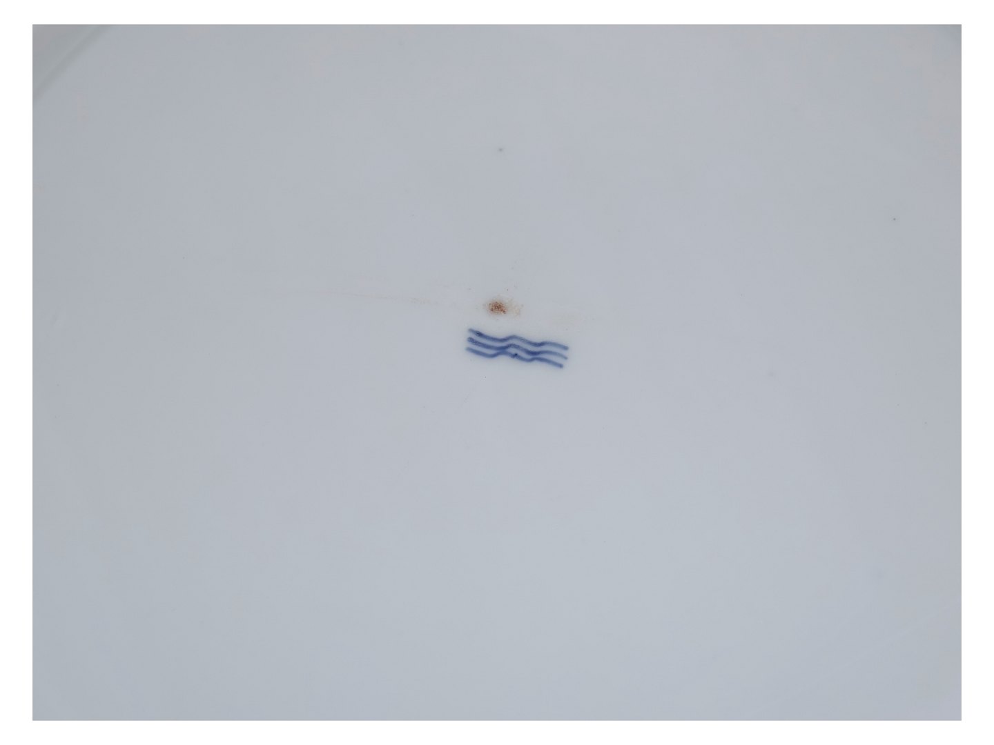 Der er lidt små pletter i glasuren og medfødt skævhed i formen. Derudover perfekt stand uden fejl.
