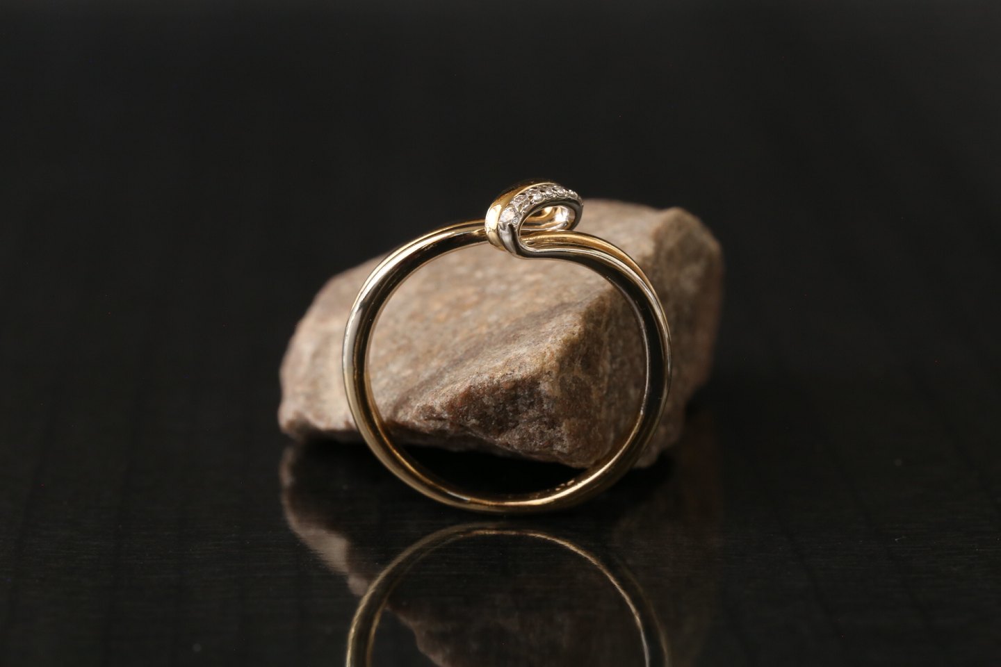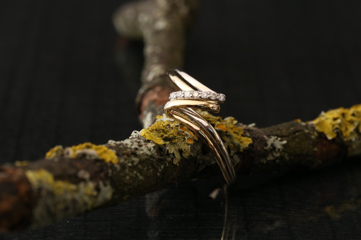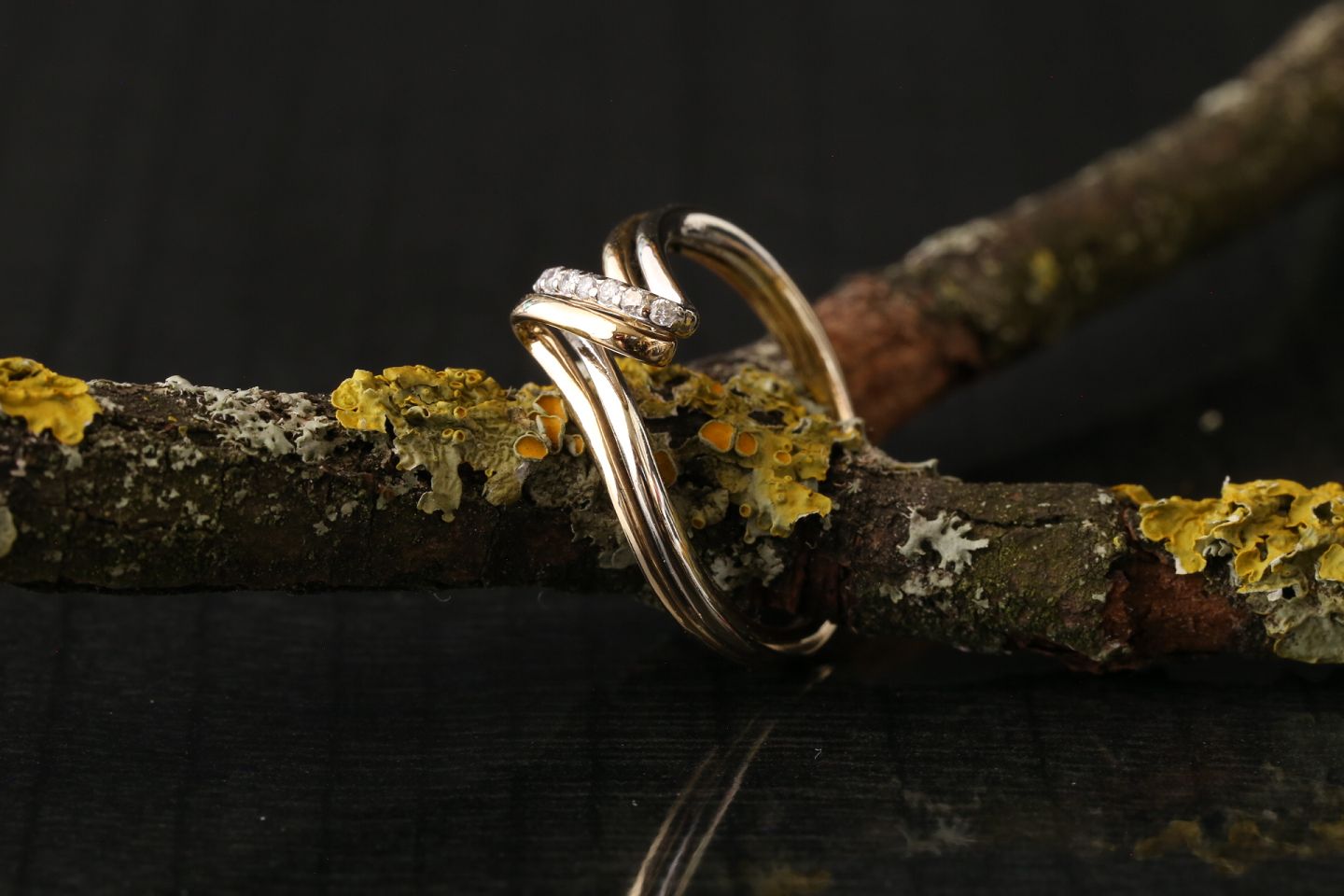 Ladies' ring made of 14 carat red and white gold with a unique beautiful structure. The soft lines of the ring, combined with the inlaid diamonds, give the ring a unique appearance that is both timeless and very elegant. Use the ring for everyday use or for a party, this ring can do both.