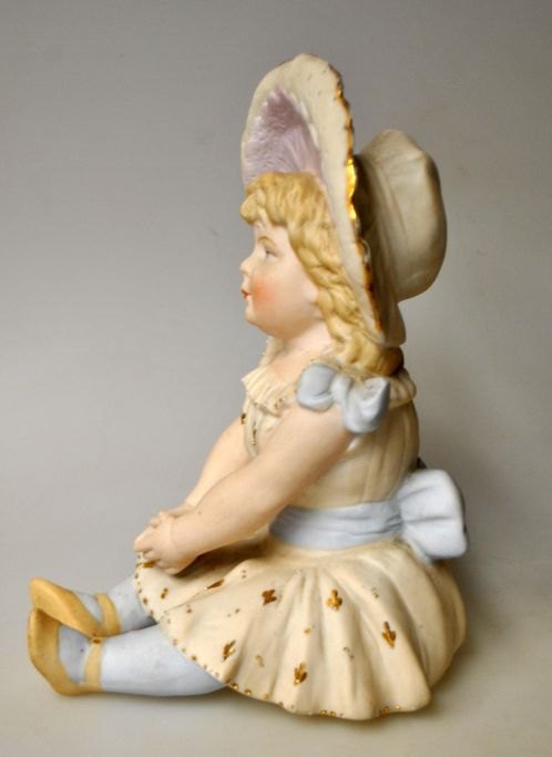 Tysk koldbemalet bisquit figur af siddende lille pige med hat, 19. årh.