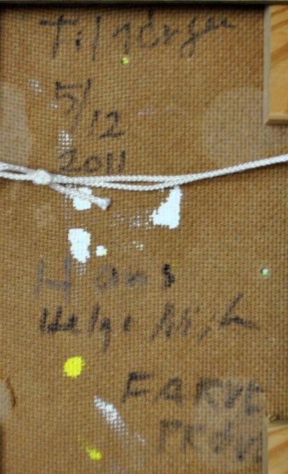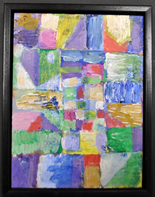 Nielsen, Hans Helge (1942- ) Denmark: Composition. Oil on masonite. Verso signed. 20 x 15 cm. Framed: 22 x 17 cm. With dedication on the back, dated 5.12.2011.