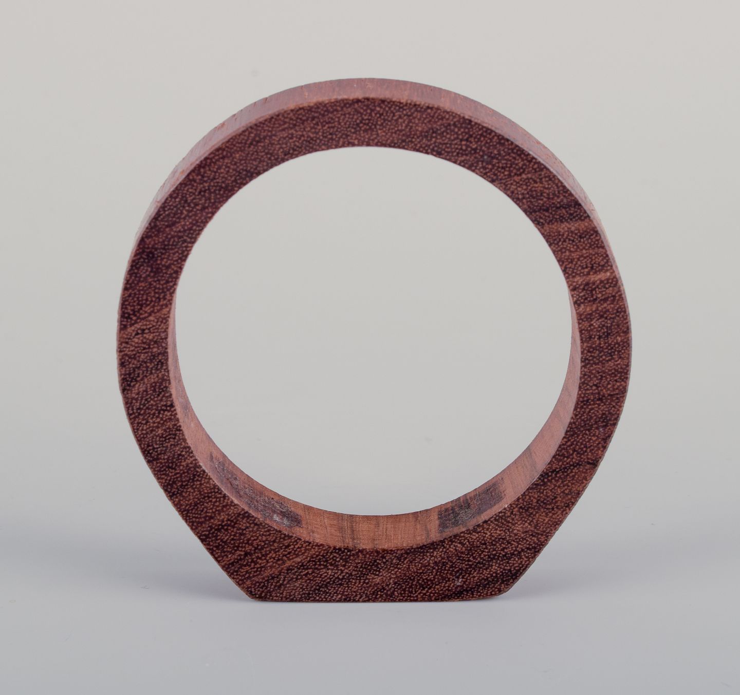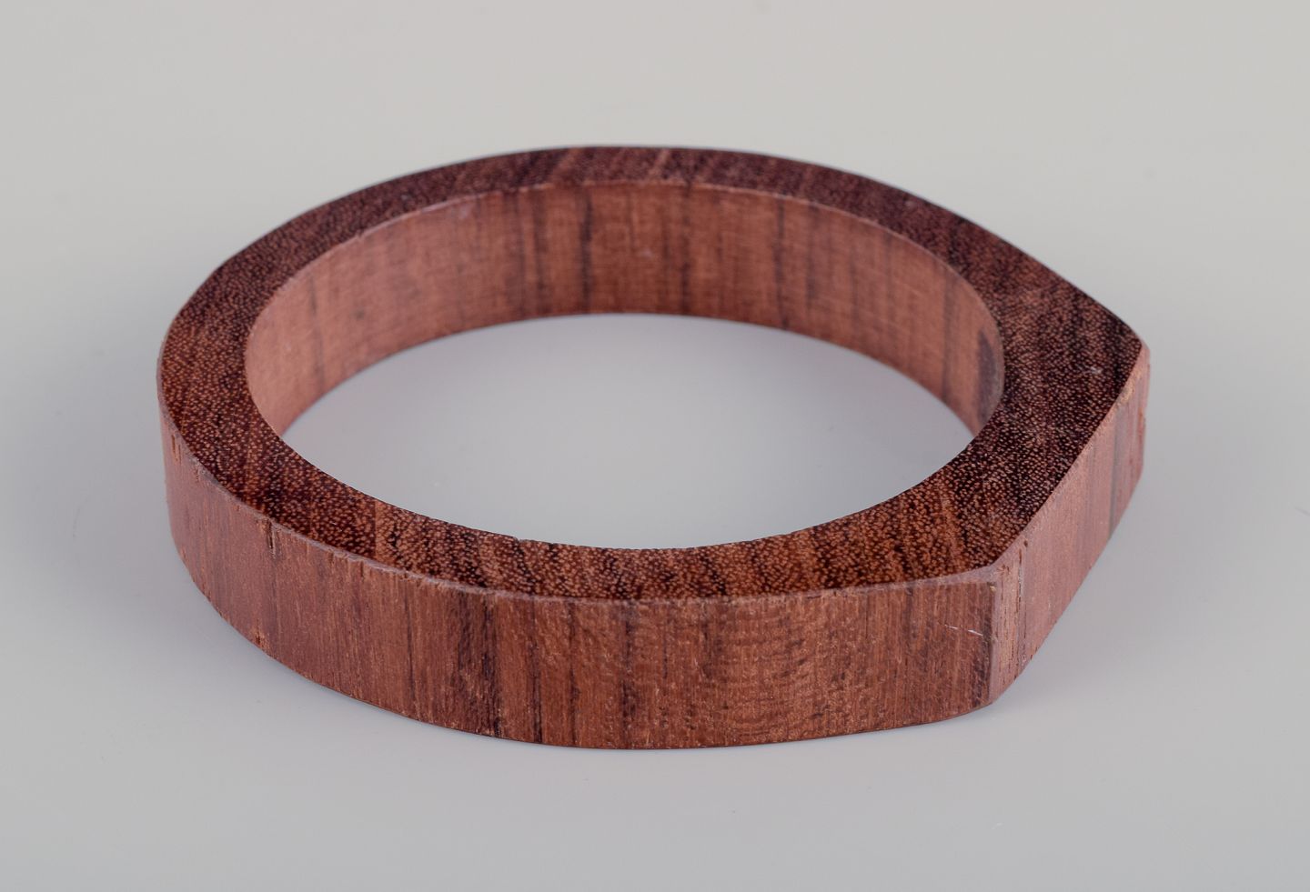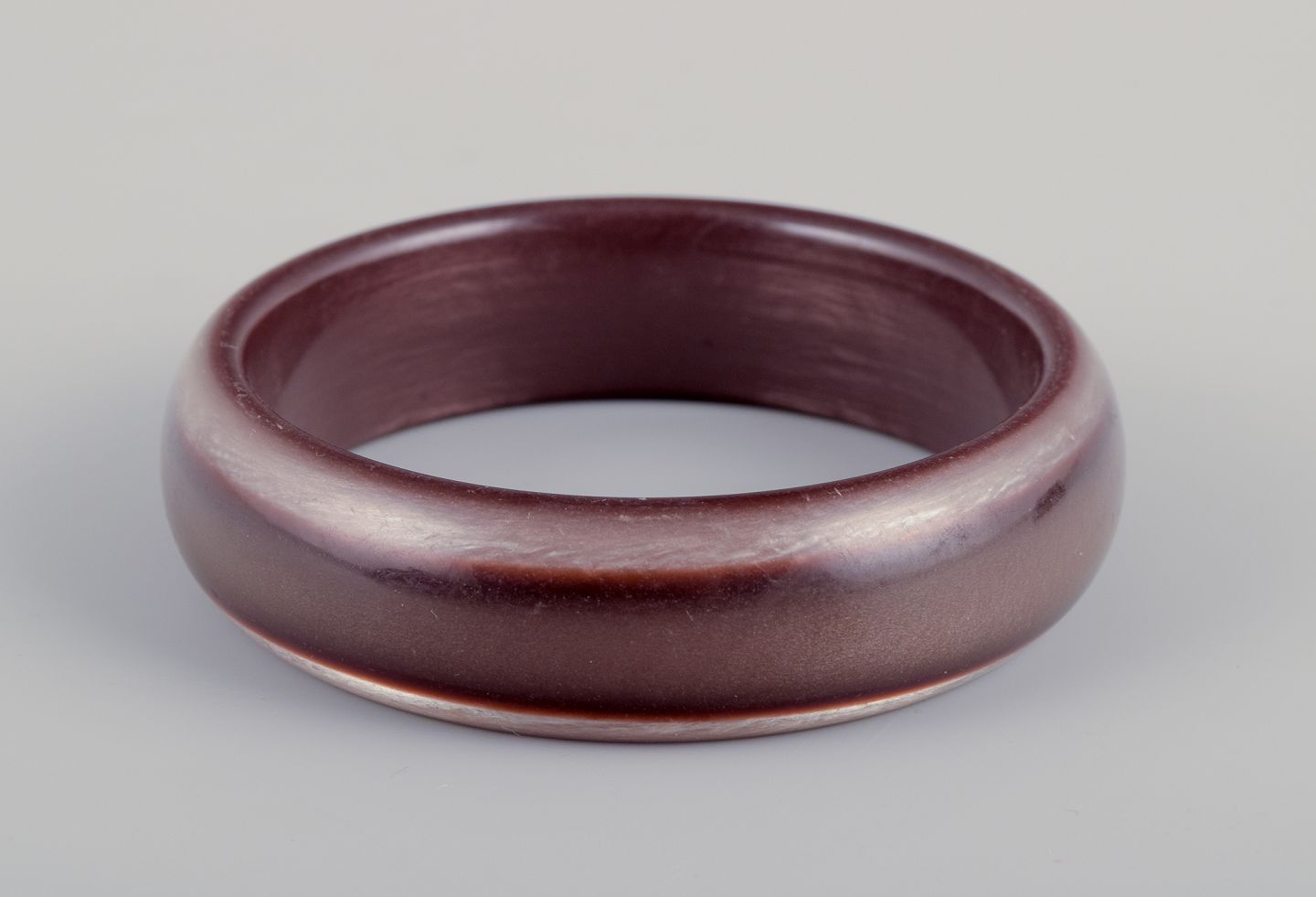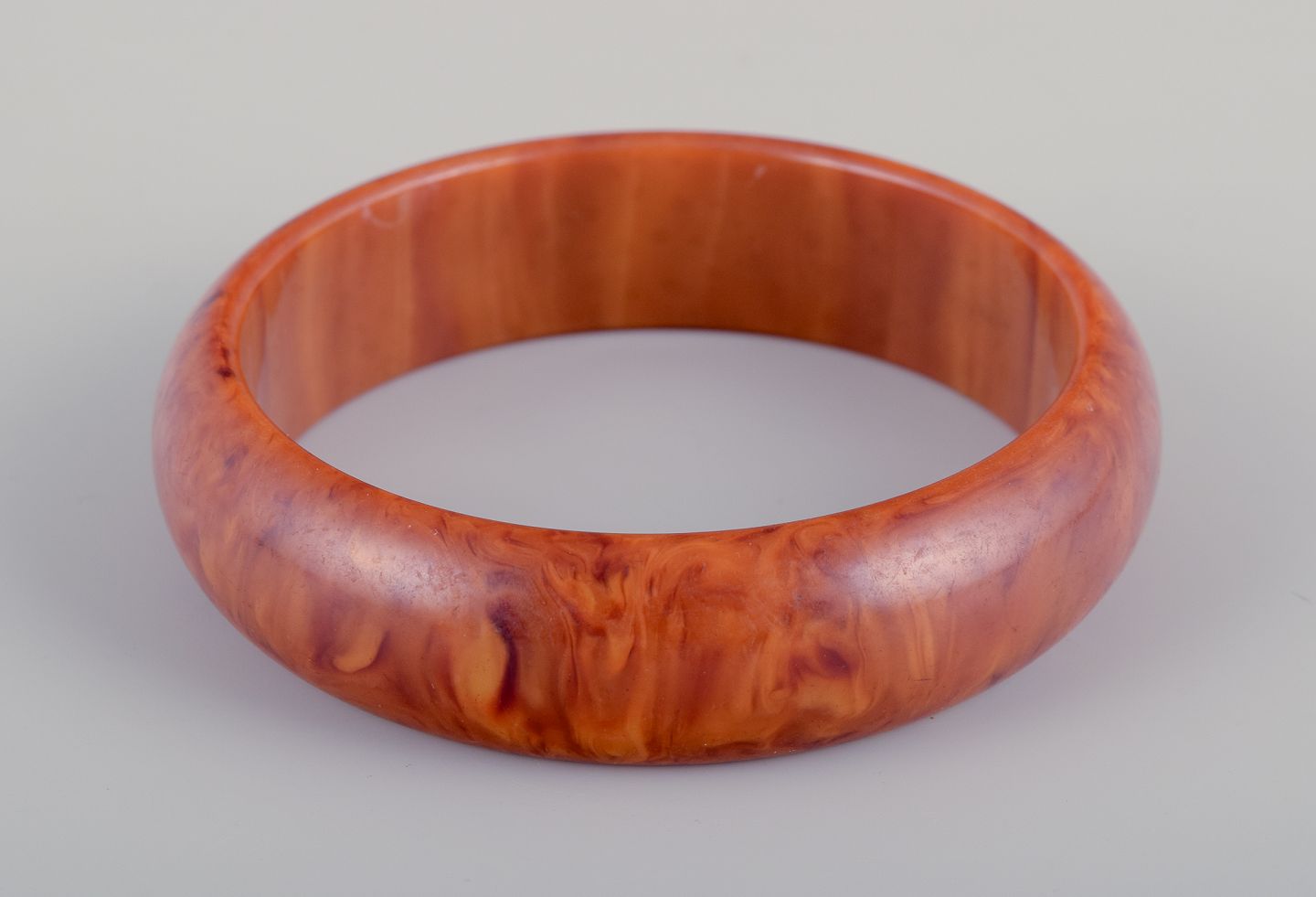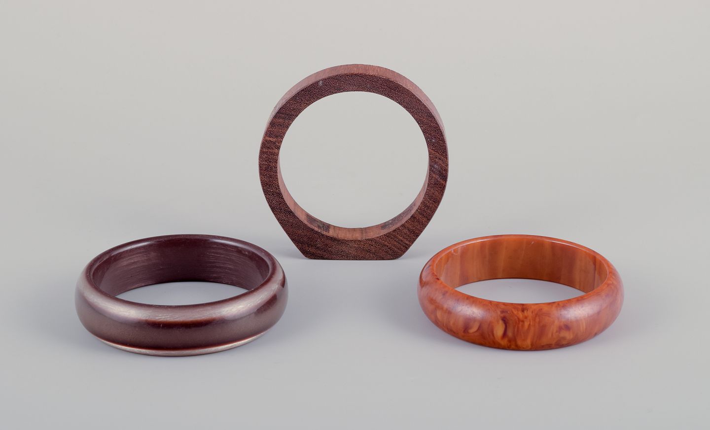 Three bracelets. Two in plastic and one in wood. Amber-colored and in shades of brown.