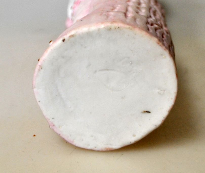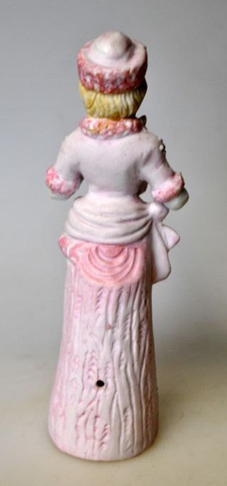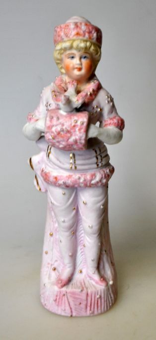 Bisquit figurine of a pink lady, 19th century Germany. Cold painted with gilded details. H: 17 cm. W: 6 cm.