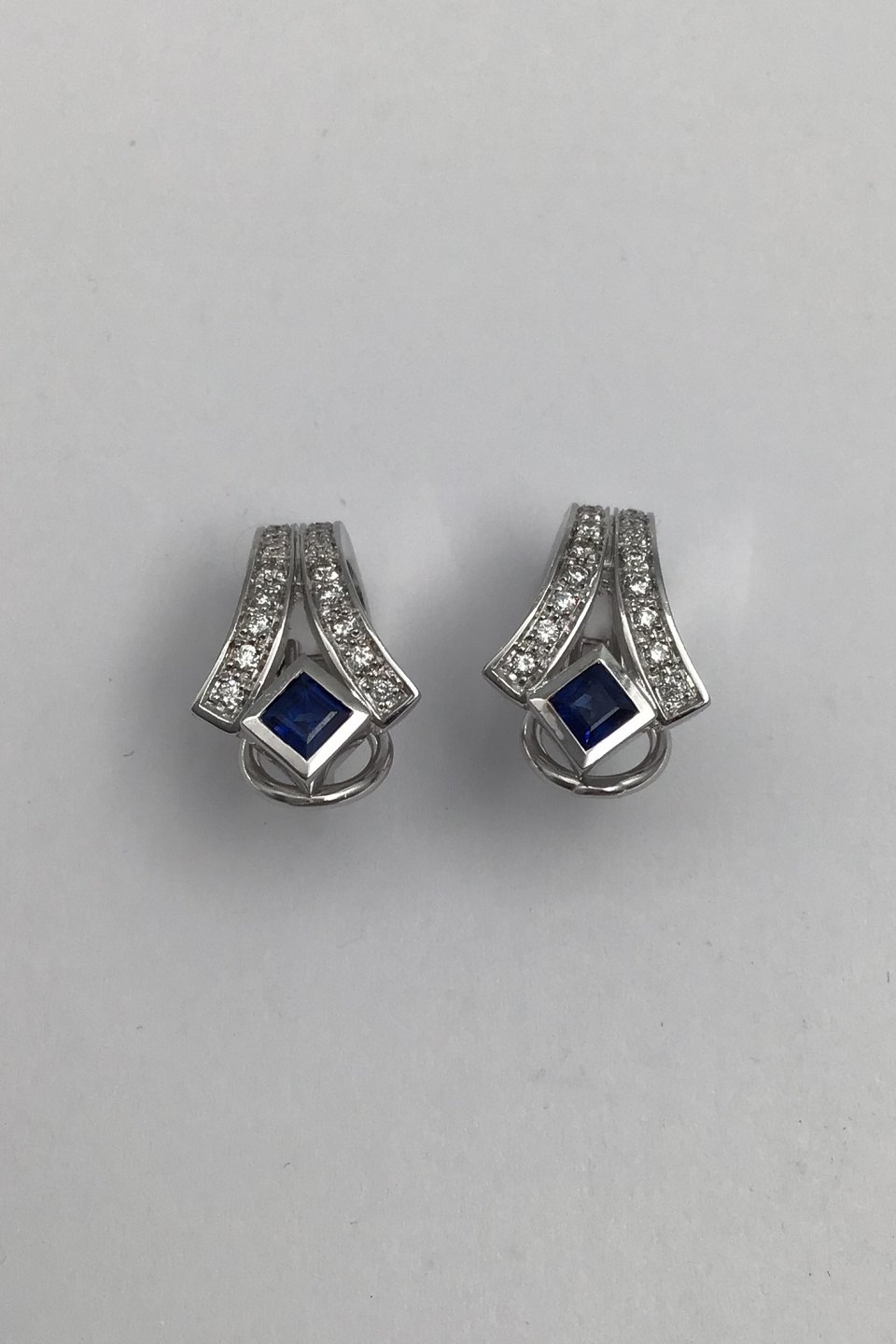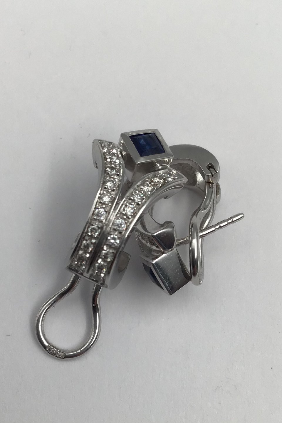 Danish 14 K Whitegold Ear Studs w Saphir & Diamonds Measures 2 cm x 1.2 cm (0.78 inch x 0.47 inch) Combined Weight 9.3 gr (0.33 oz)