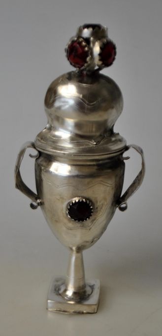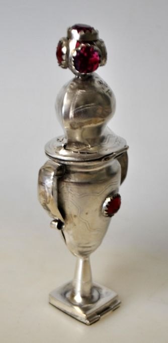 Silver empire vinagre egg with glass, 19th century Denmark. With conditioner. Indistinct master stamp. With engravings: SOS/KAD. In safe: Helen 22-10-1919. H.: 12.5 cm.