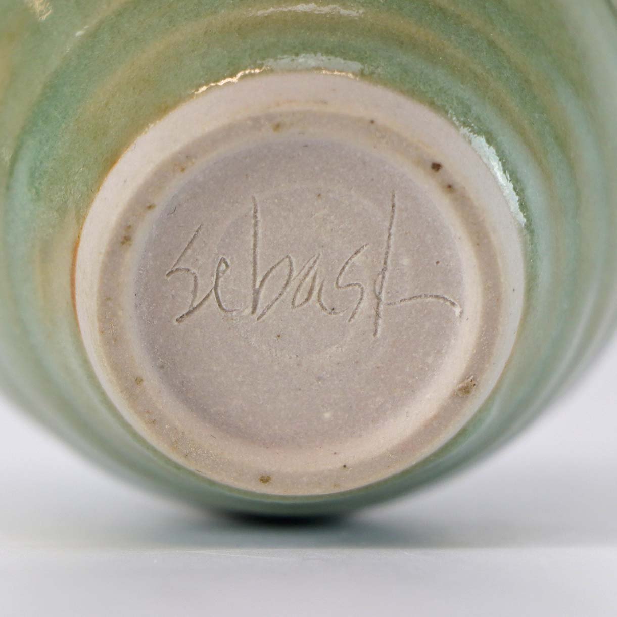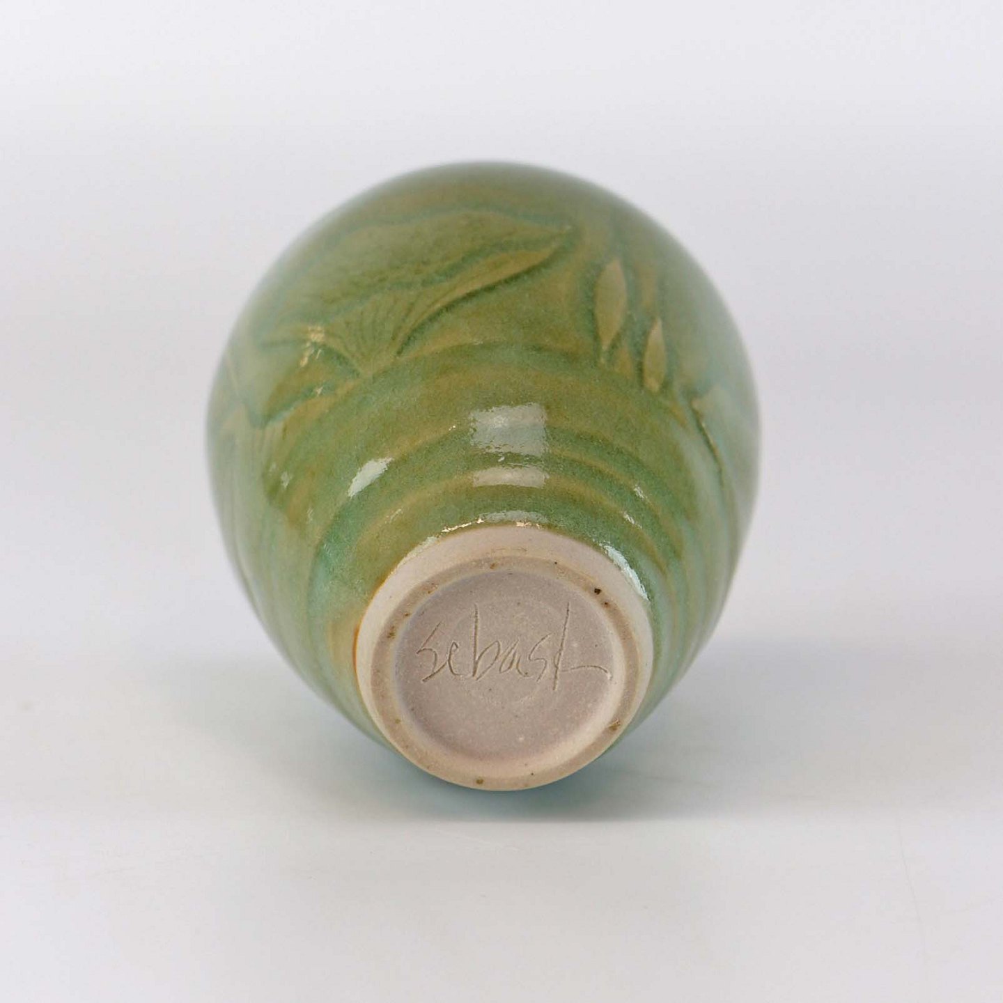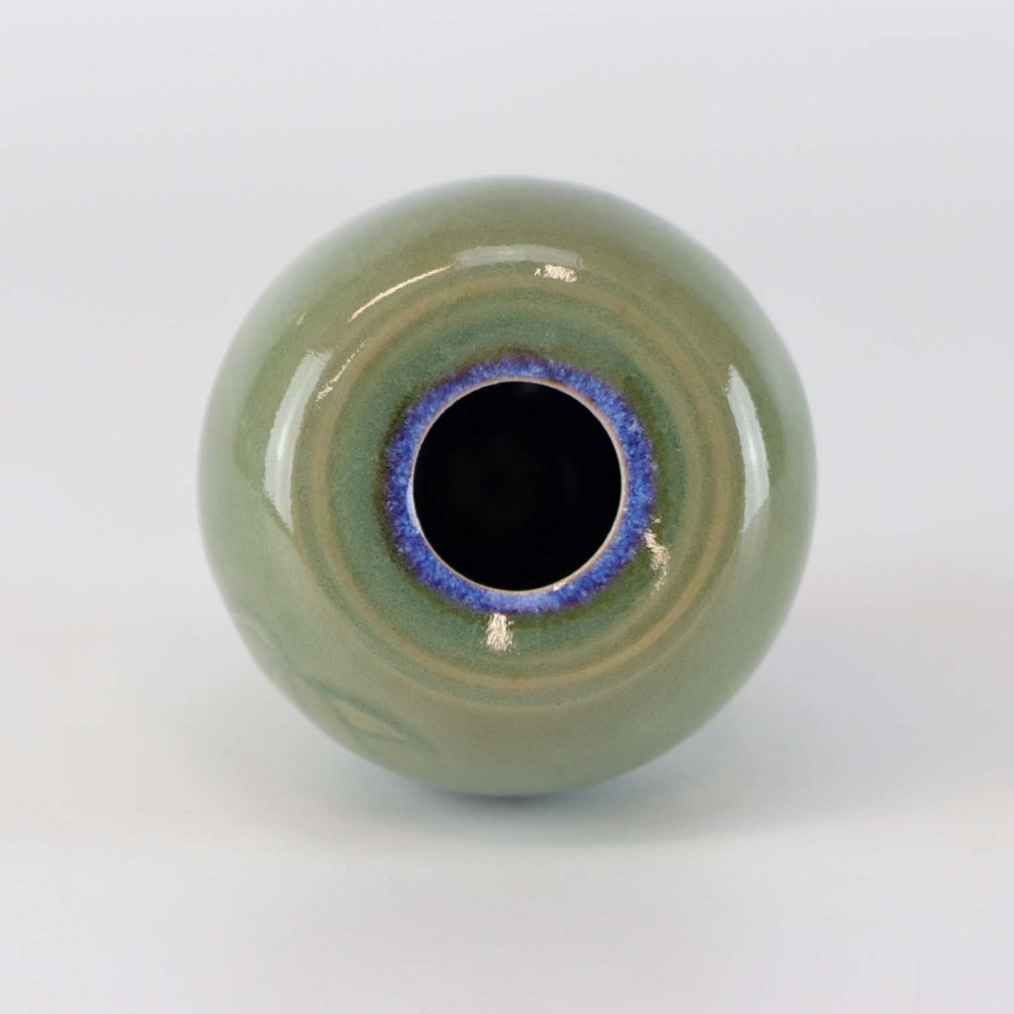 Miniature vase i grøn glaseret stentøj med blå topkant med motiv af blomst og planter