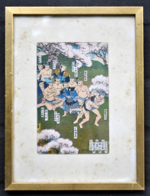 Japansk kunstner (19. årh.): Sumobrydere. Farvelagt litografi. 9 x 14 cm. Indrammet: 17,5 x 23 cm.