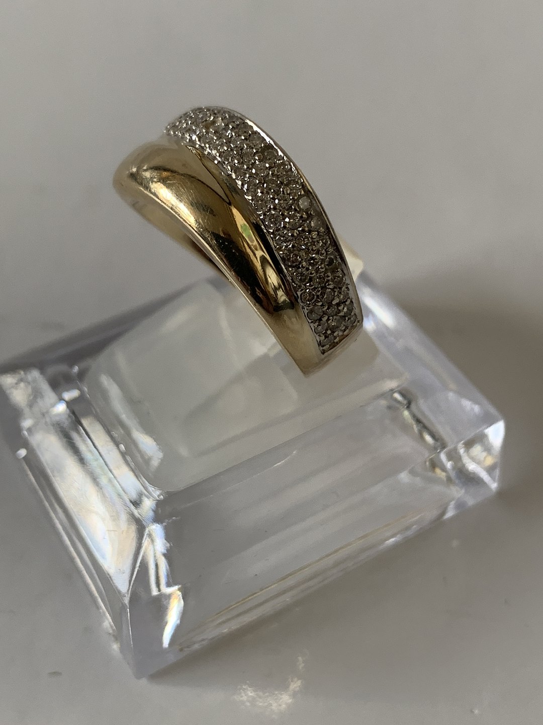 Flot og elegant damering i guld, og med flotte bløde former. Der giver ringen en flot levende look. De indlagte brillanter, giver ringen et enormt liv. Ringen kan bruges til både hverdag og fest, hvor den kan anvendes alene eller i kombination med andre ringe.