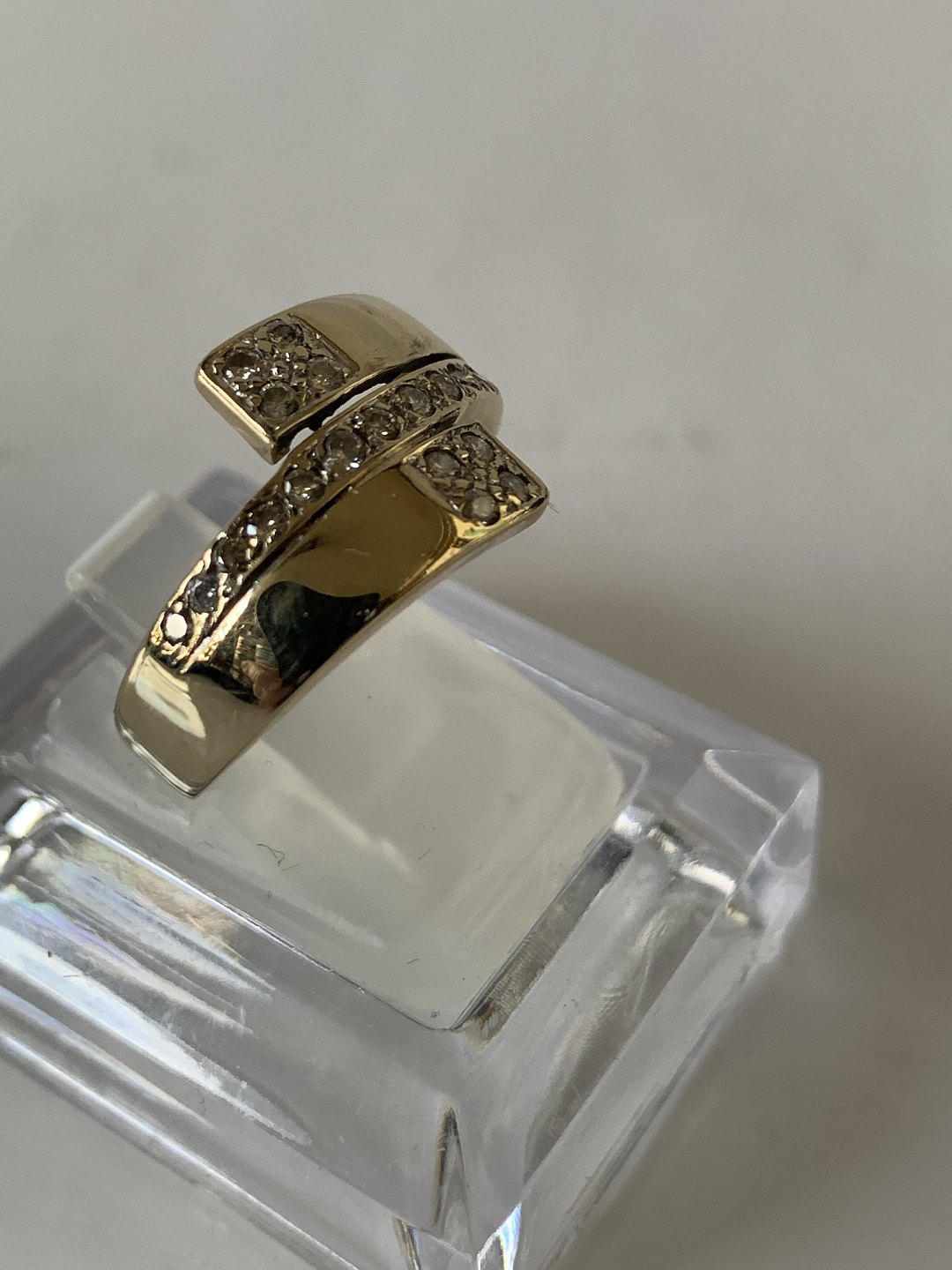 Flot og elegant damering i guld, og med flotte bløde former. Der giver ringen en flot levende look. De indlagte brillanter, giver ringen et enormt liv. Ringen kan bruges til både hverdag og fest, hvor den kan anvendes alene eller i kombination med andre ringe.