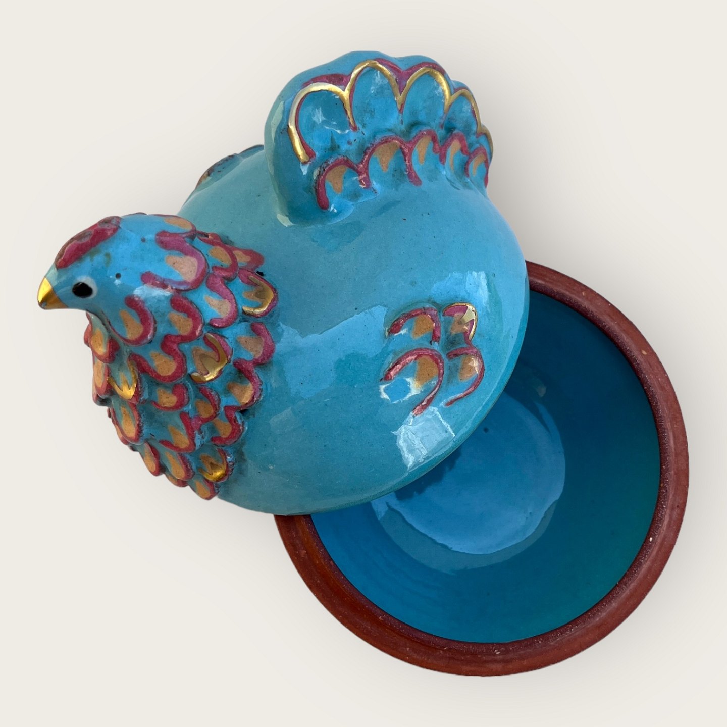 Ulla Sonne, Keramik høne / Skål, Turkis glasur, 12cm i diameter, 11cm høj *Pæn stand dog enkelte skrammer/glasurfejl på fuglens kam (se foto)*