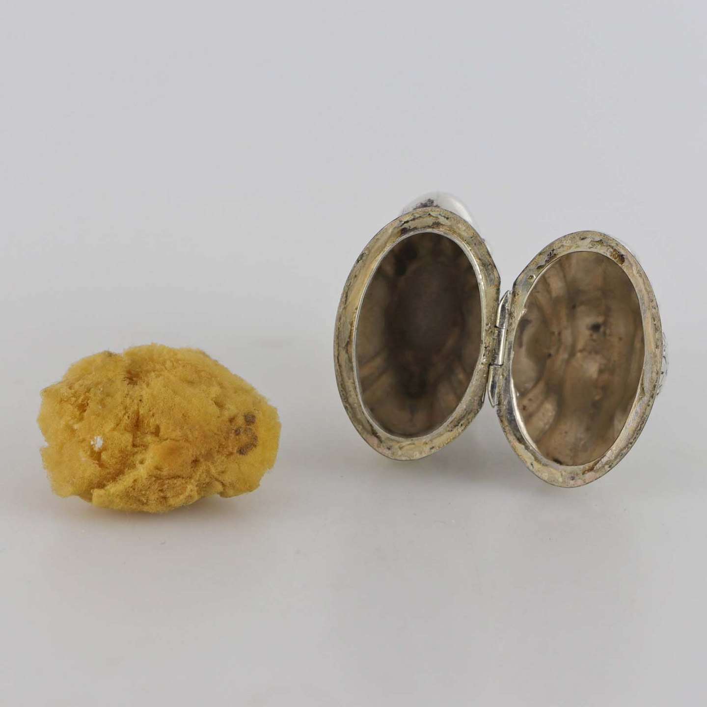Text available in Danish: Antik hovedvandsæg i sølv med blomstermønster. Ægget indeholder en svamp