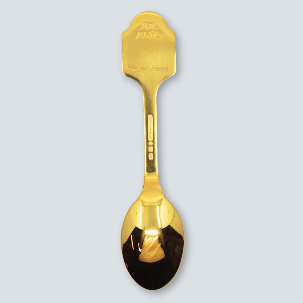 Bent Karl Jacobsen for Anton Michelsen; A christmas spoon 1986. Spoon of gilt sterling silver with enamel. Designed by Bent Karl Jacobsen, b. 1934, d. 2004. Danish design silver.