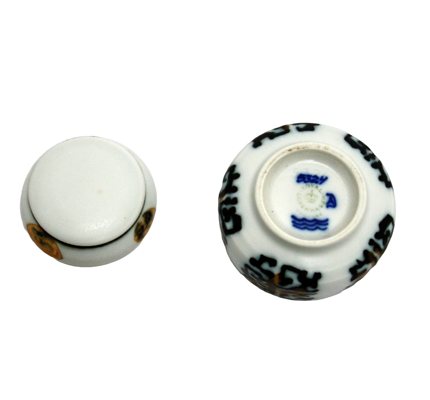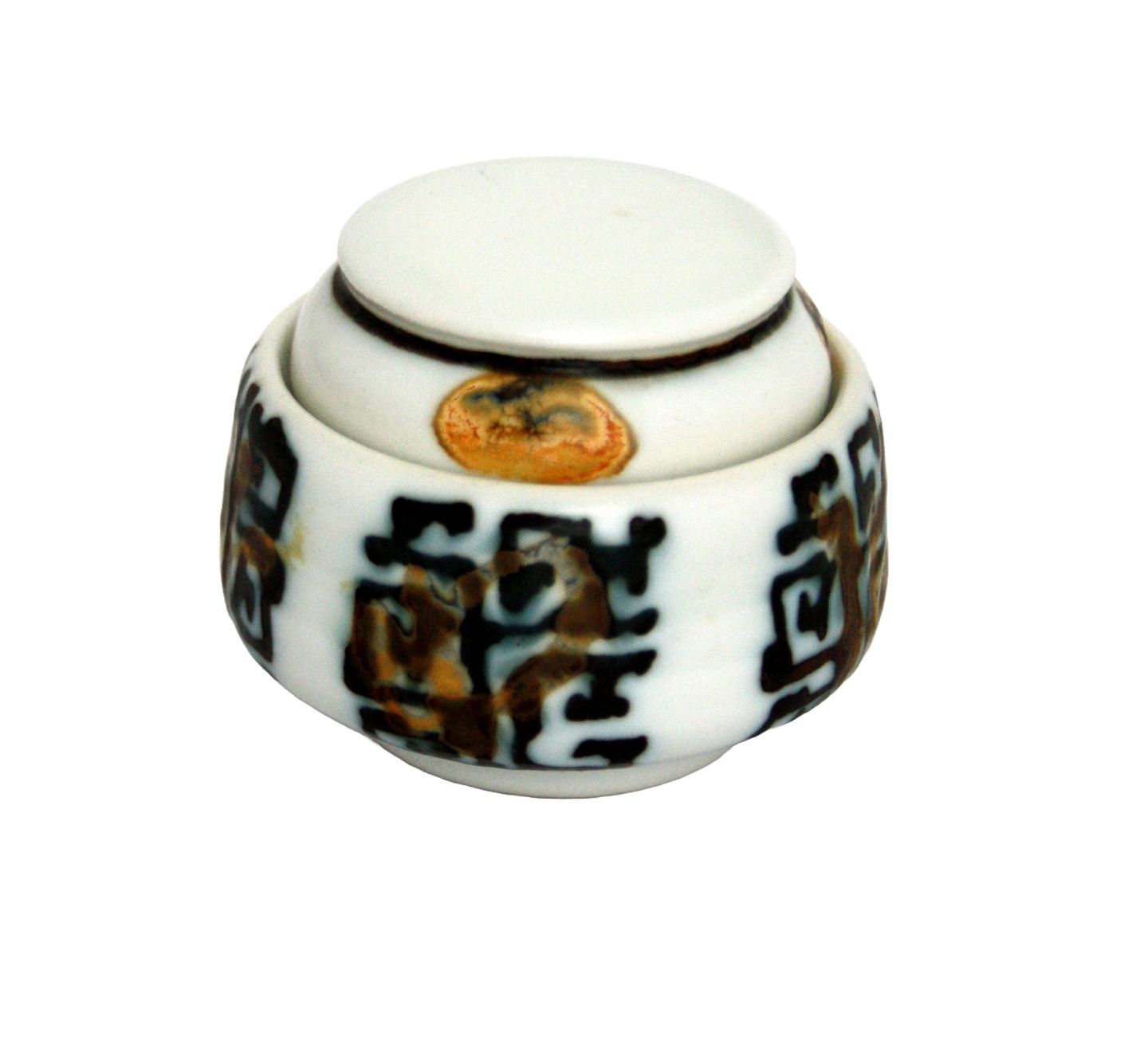 Royal Copenhagen, kunstfajance, Miniature bojan med orientalske skrifttegn. Nr. 5324. Højde 5 cm. Diameter 6 cm. I. sortering. Pris: 300 kr. stk. Lager: 1