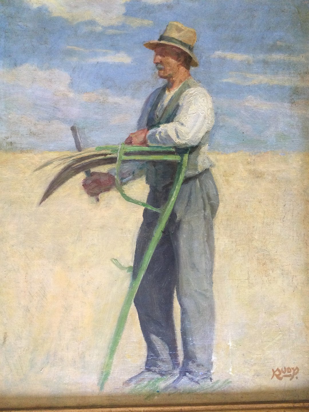 Bagpå udstillingsmærkat 1954 "Karl med Mejeredskab" Forarbejde til Høstbillede.