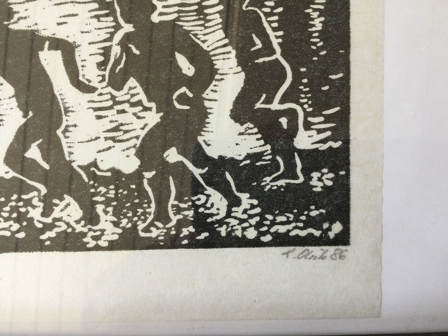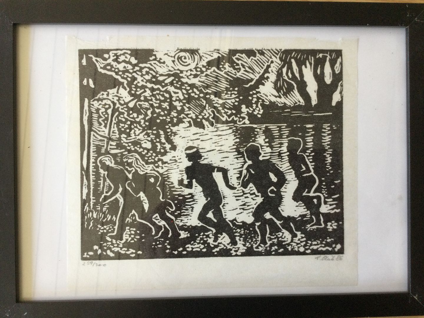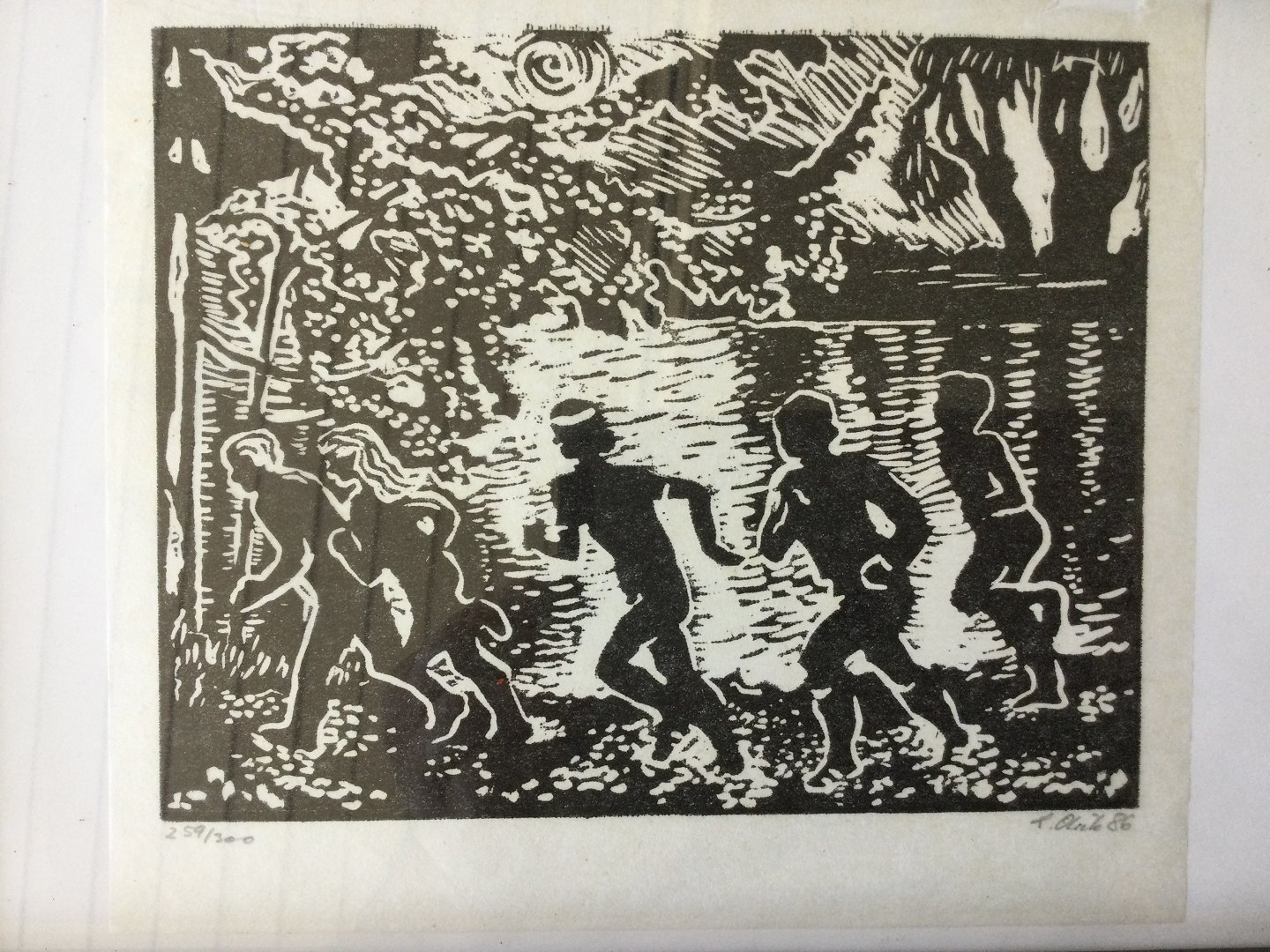 Træsnit af Lisbet Olrik - Løbende personer 1986.