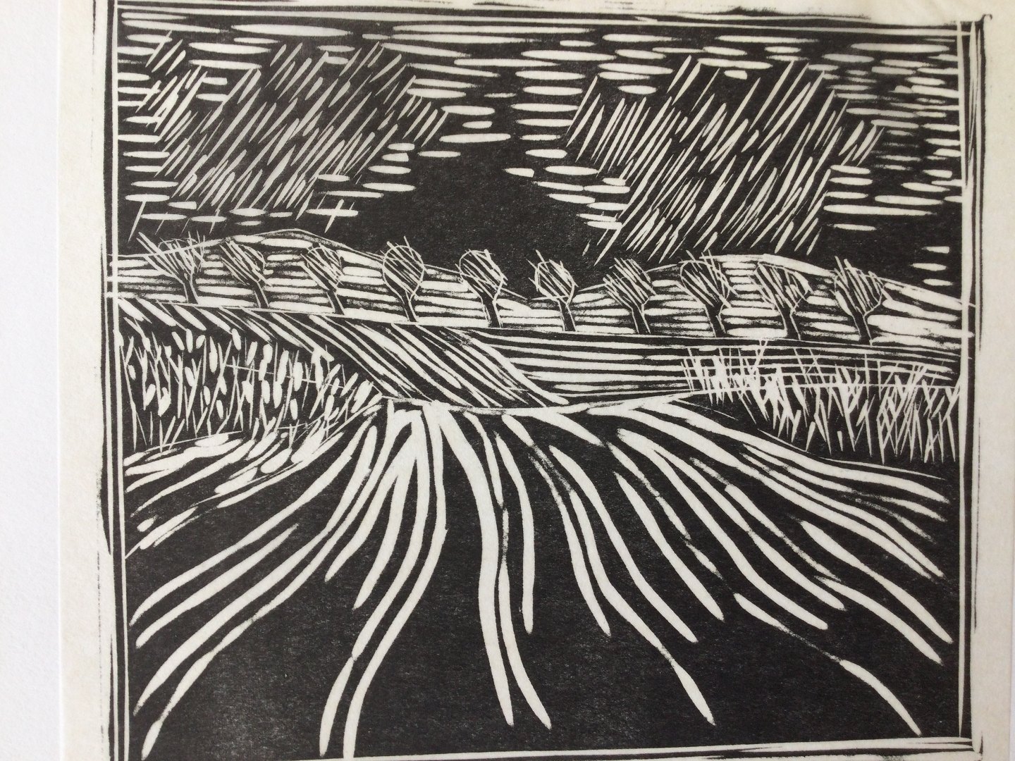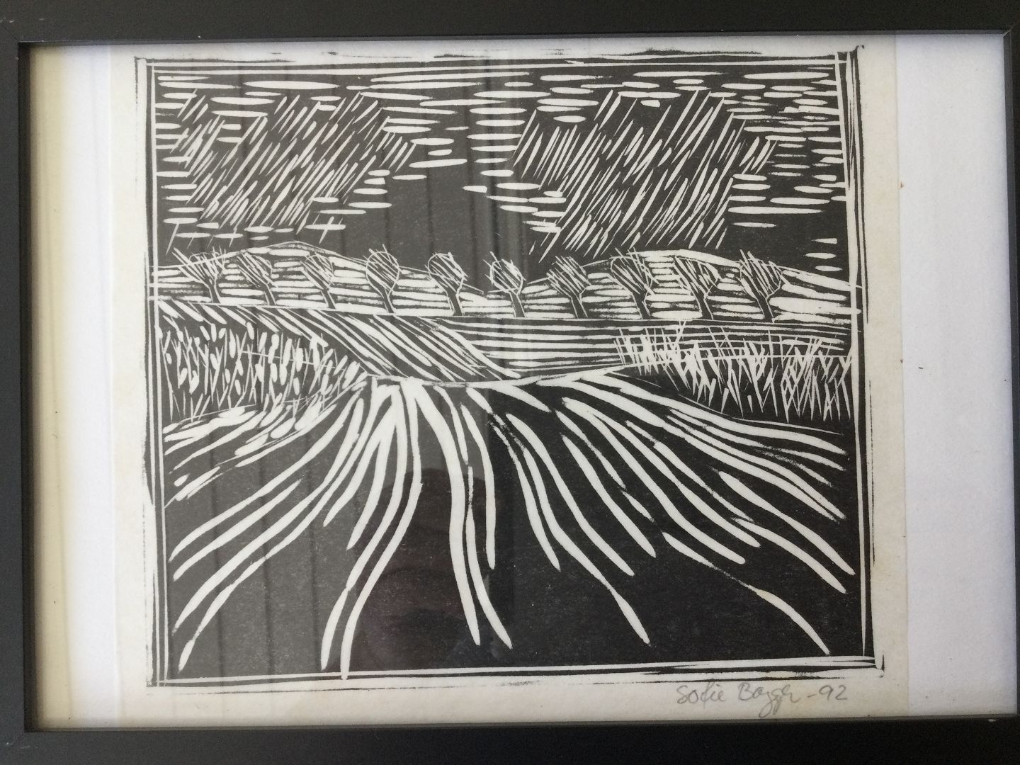 Linoleumssnit af Sofie Bagger - Landskab Vendsyssel 1992..