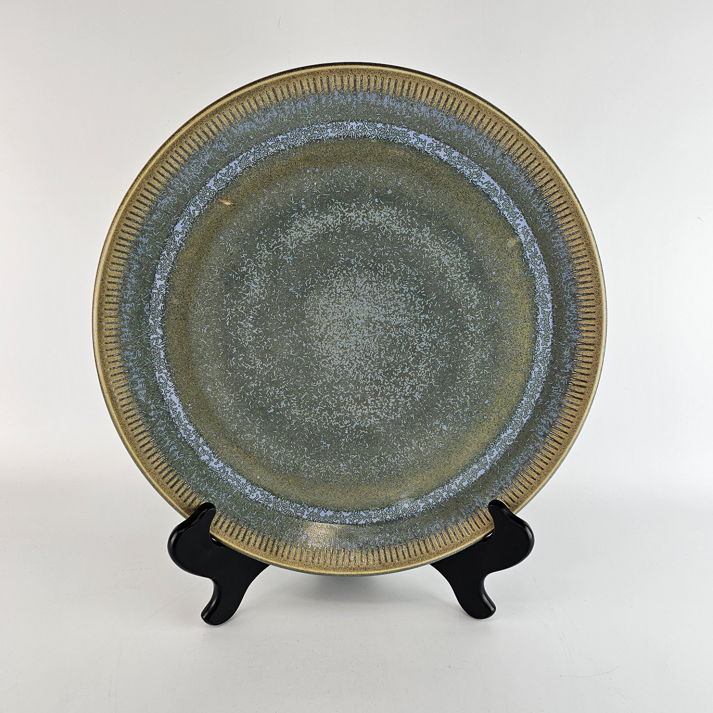 Text available in Danish: Rundt fad af stentøj og dekoreret med en grønlig nuancefarvet glasering.