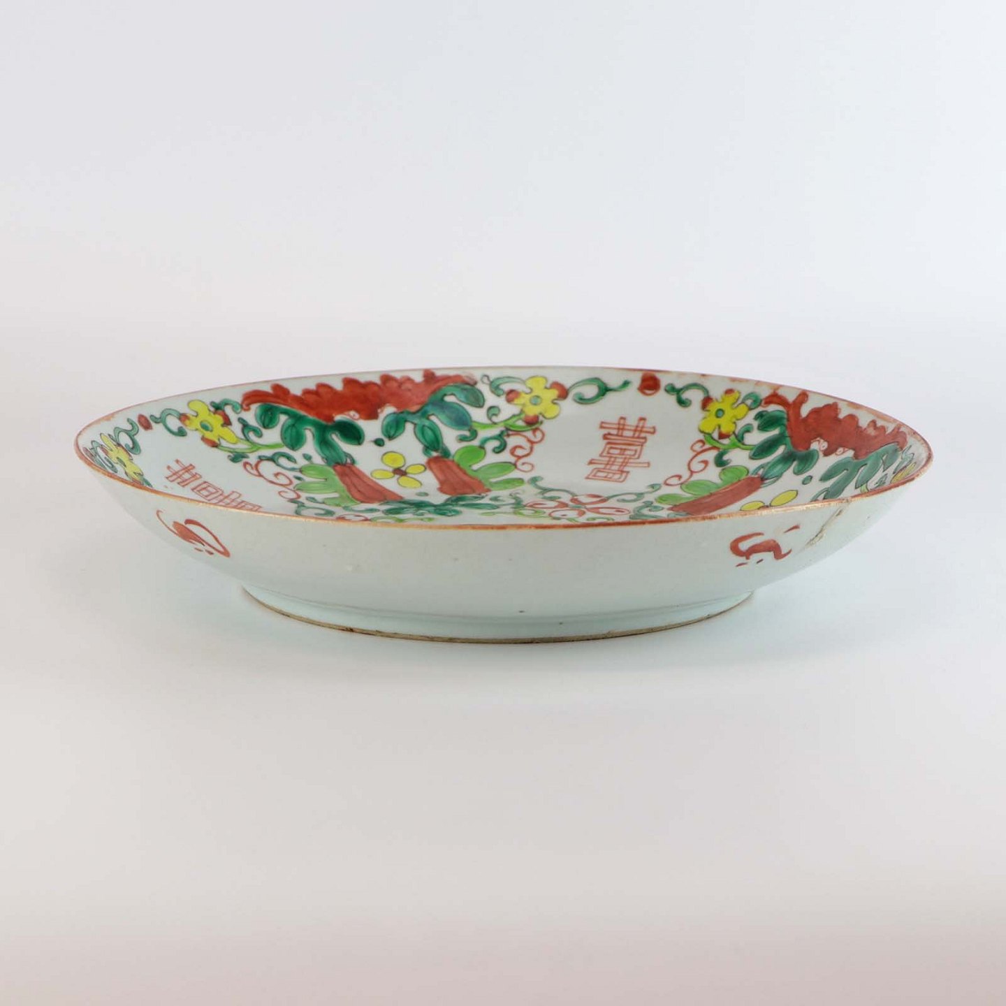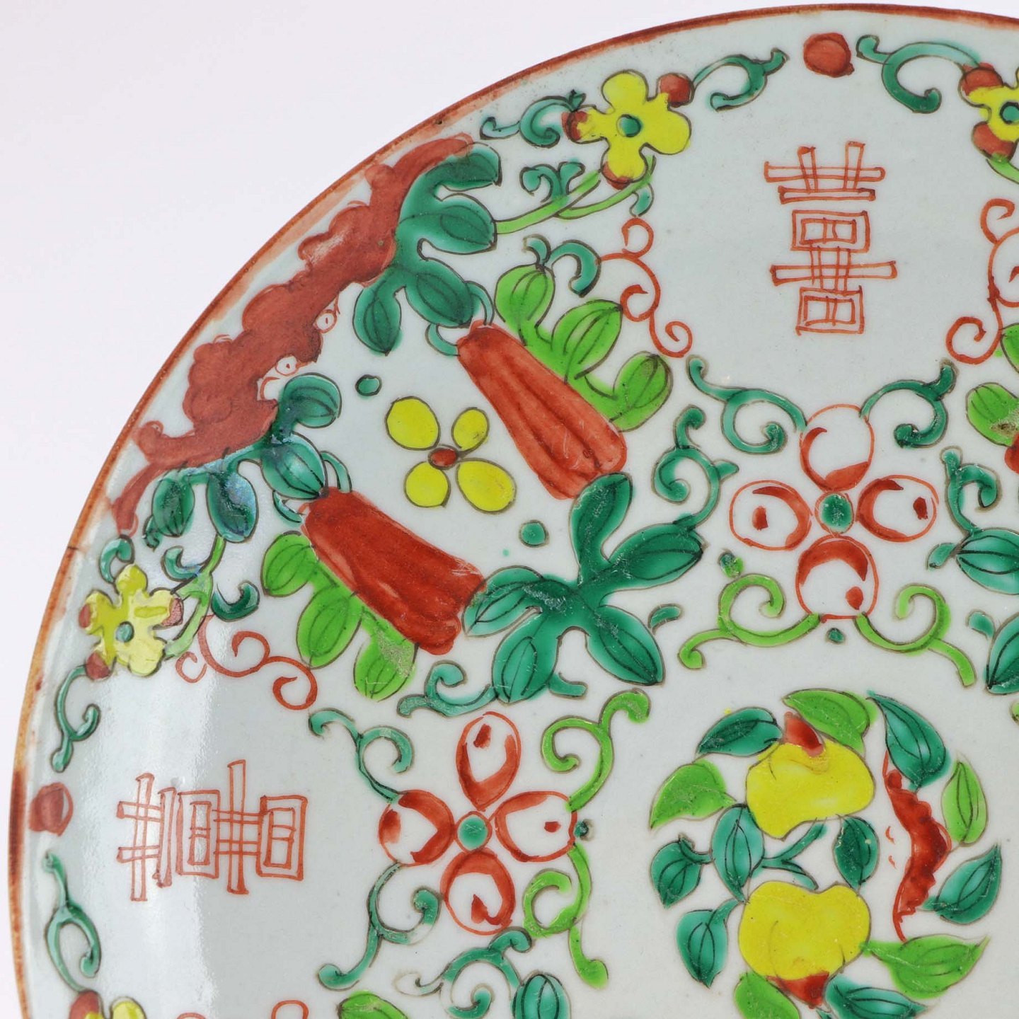 Rundt fad i porcelæn med kinesiske frugt- og blomstermotiver samt skrift dekoration. Fra 1700 tallet