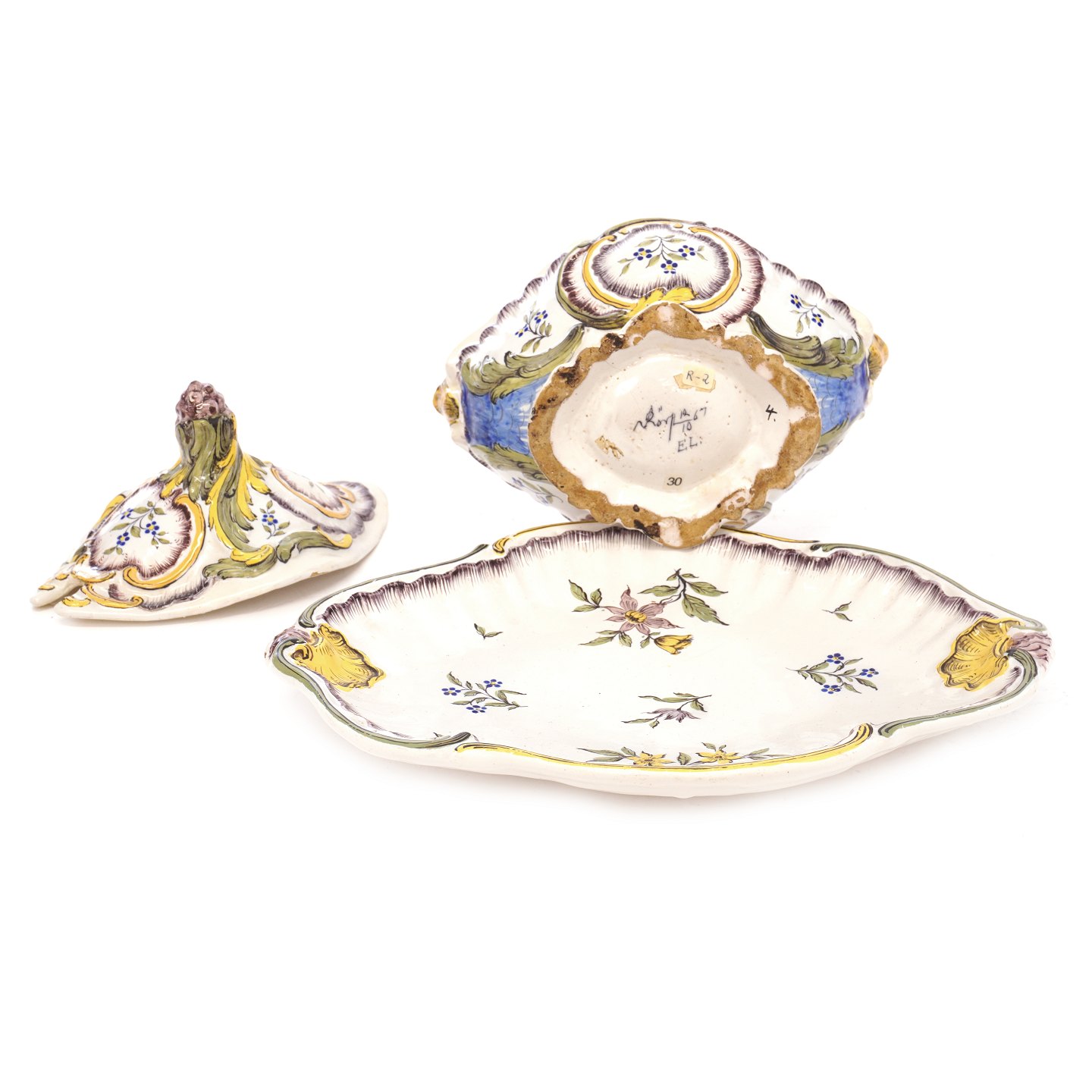 Lille polykromdekoreret fajanceterrin med underfad signeret Rörstrand 12/10 1767. H: 18cm. L: 28cm |