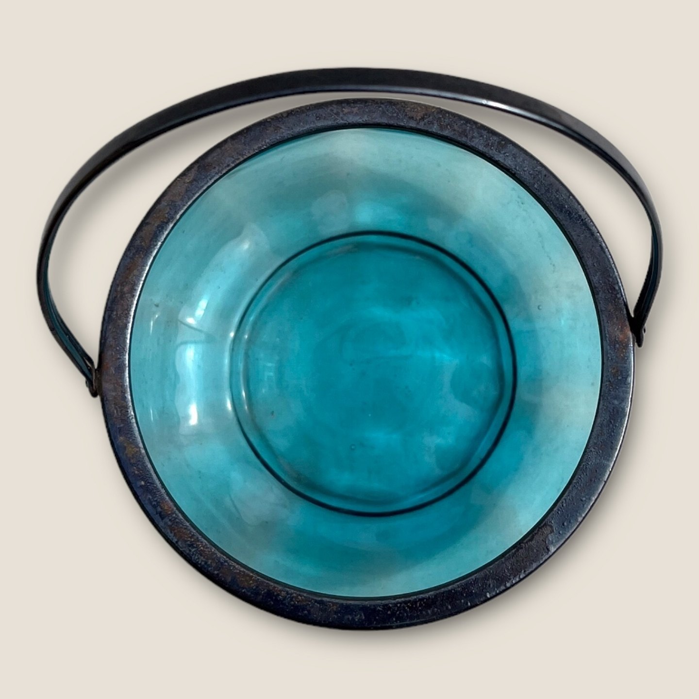 Kandis skål, Blå glas med metal montering, 11cm i diameter, 5,7cm høj *Pæn stand*