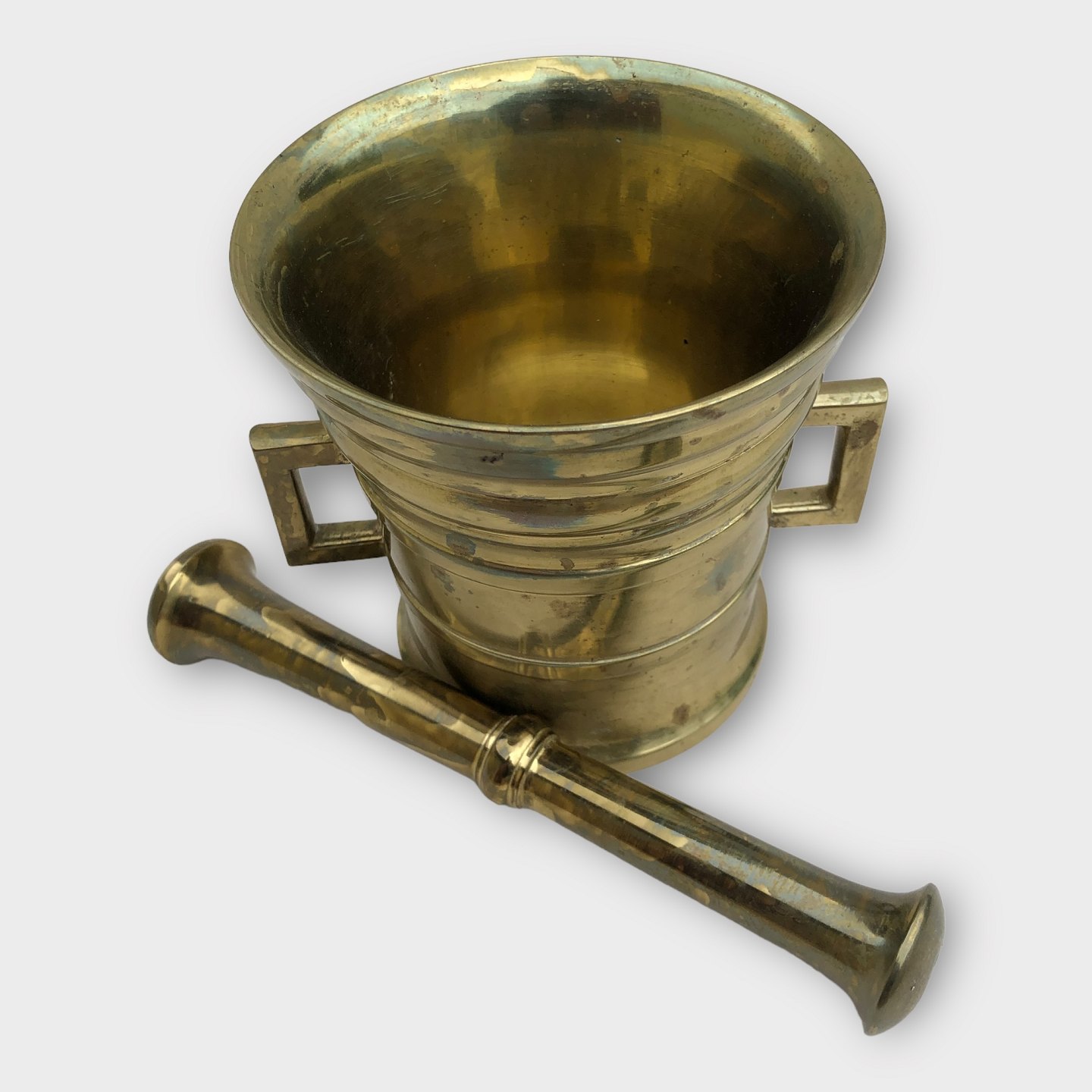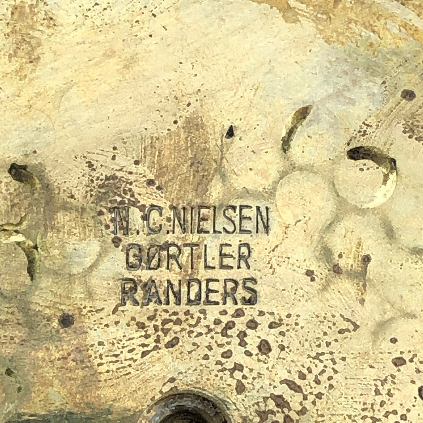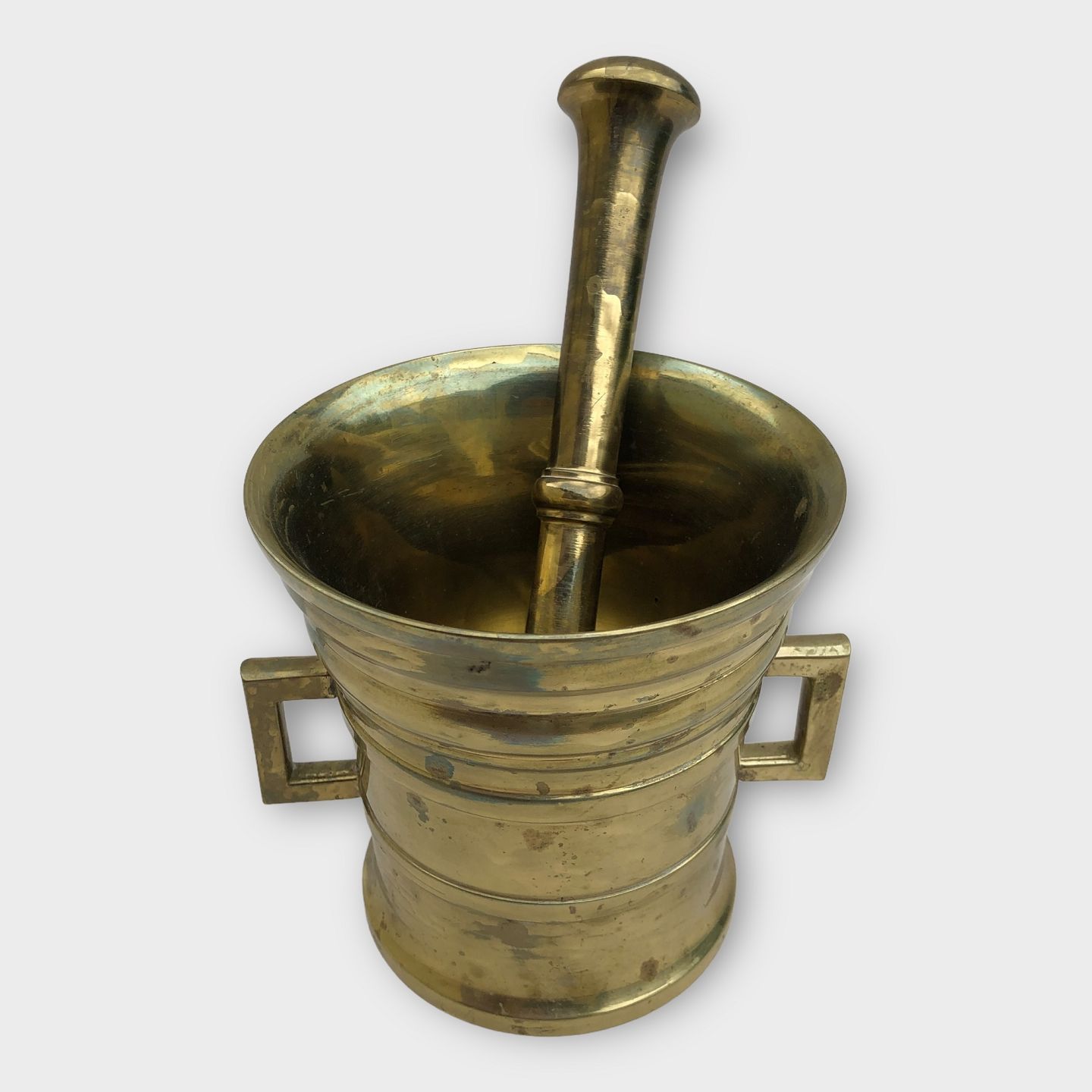 Tung Messing morter med pistel, Fremstillet hos Gørtler: N.C. Nielsen i Randers i det 20 århundrede. Højde x bredde: 14x14 cm, Pestel: 23cm, Samlet vægt 4880g