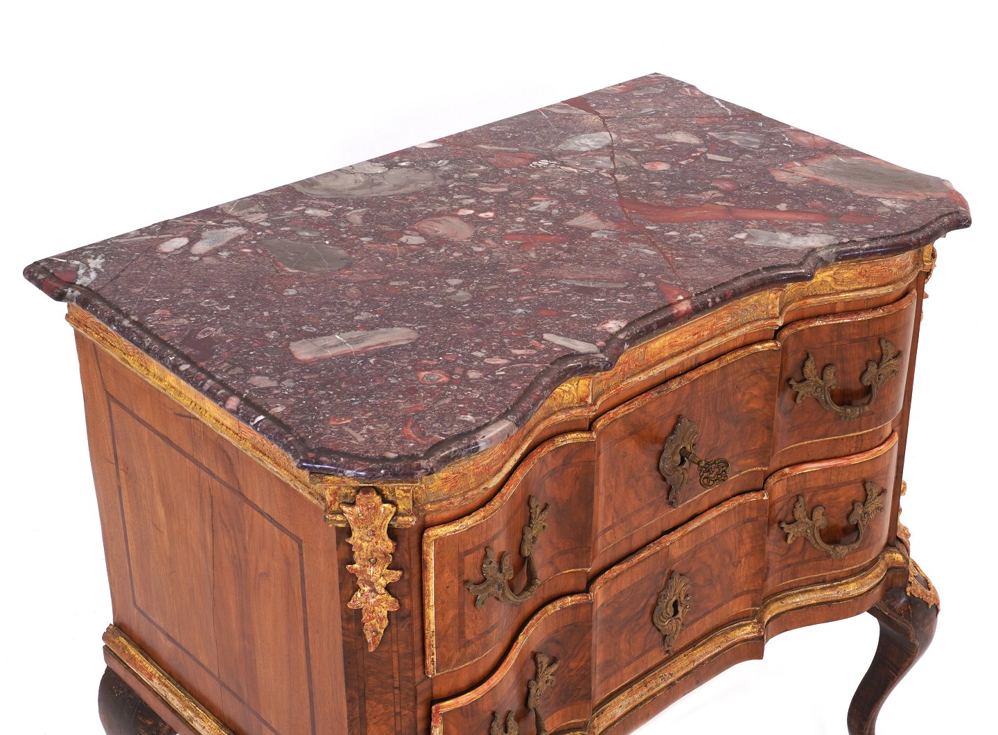 Nøddetræsfineret kommode med delvise forgyldninger og rødlig marmorplade. Altona ca. år 1760-70. H:76cm. Plade: 80x43cm