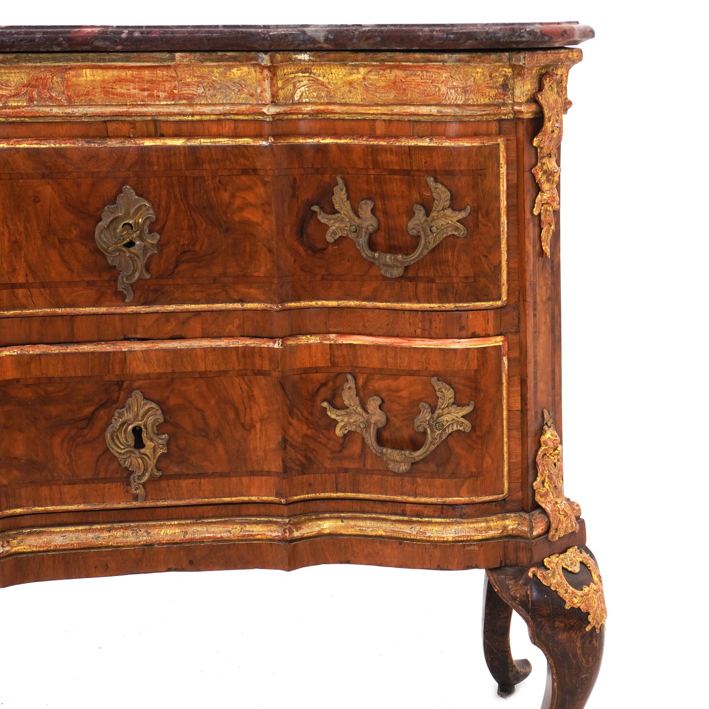 Nøddetræsfineret kommode med delvise forgyldninger og rødlig marmorplade