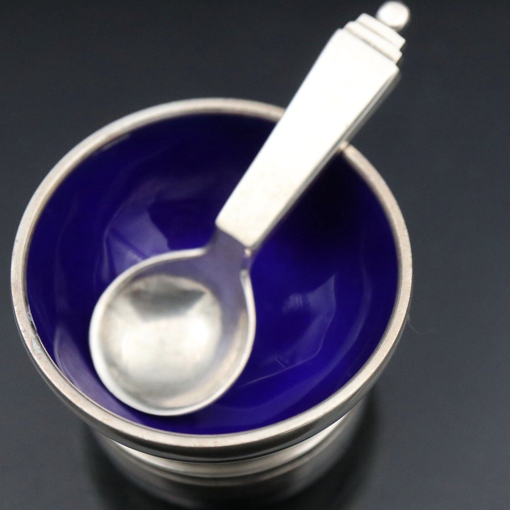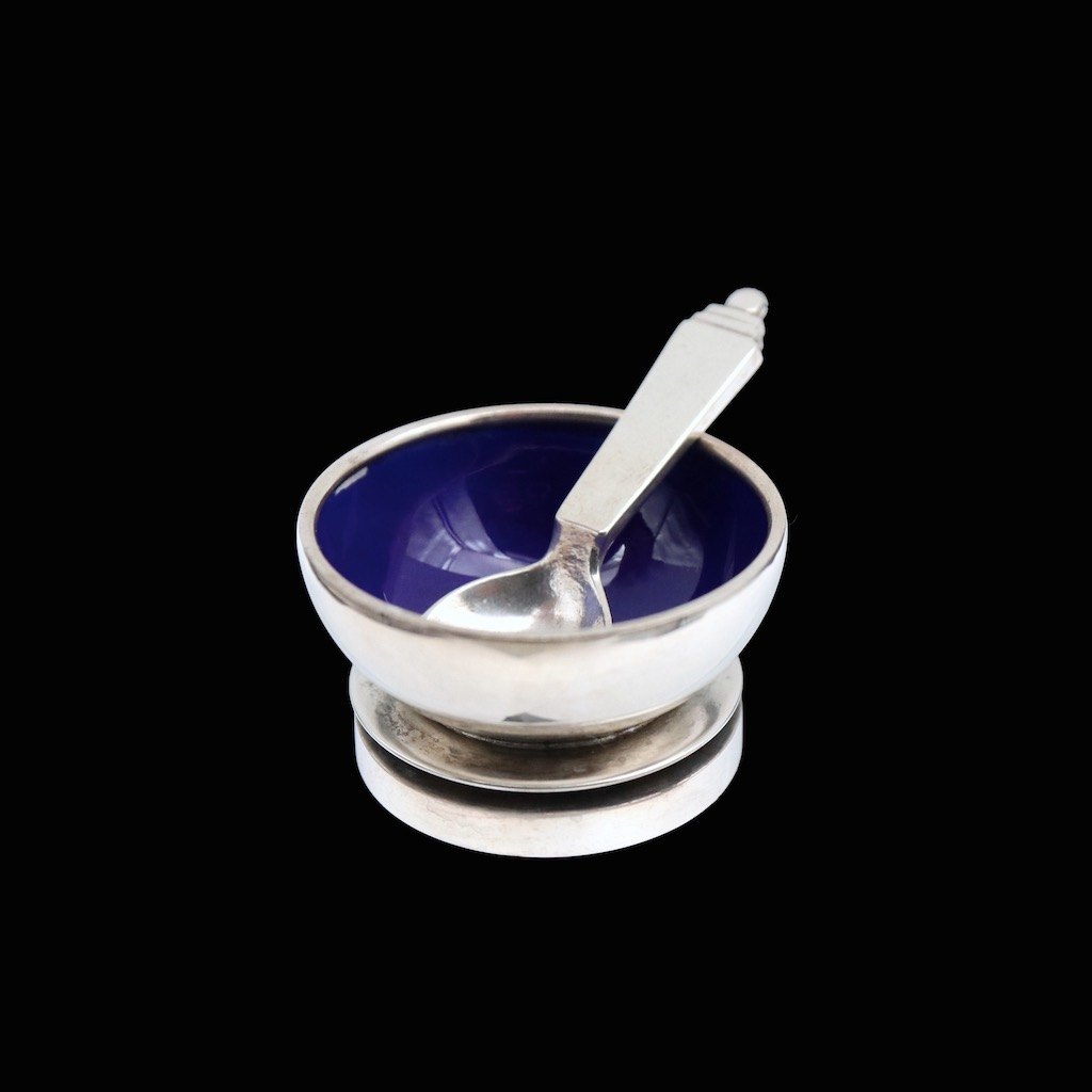 Georg Jensen. Saltkar #632 i sterling sølv med blå emalje med tilhørende ske - Pyramide.