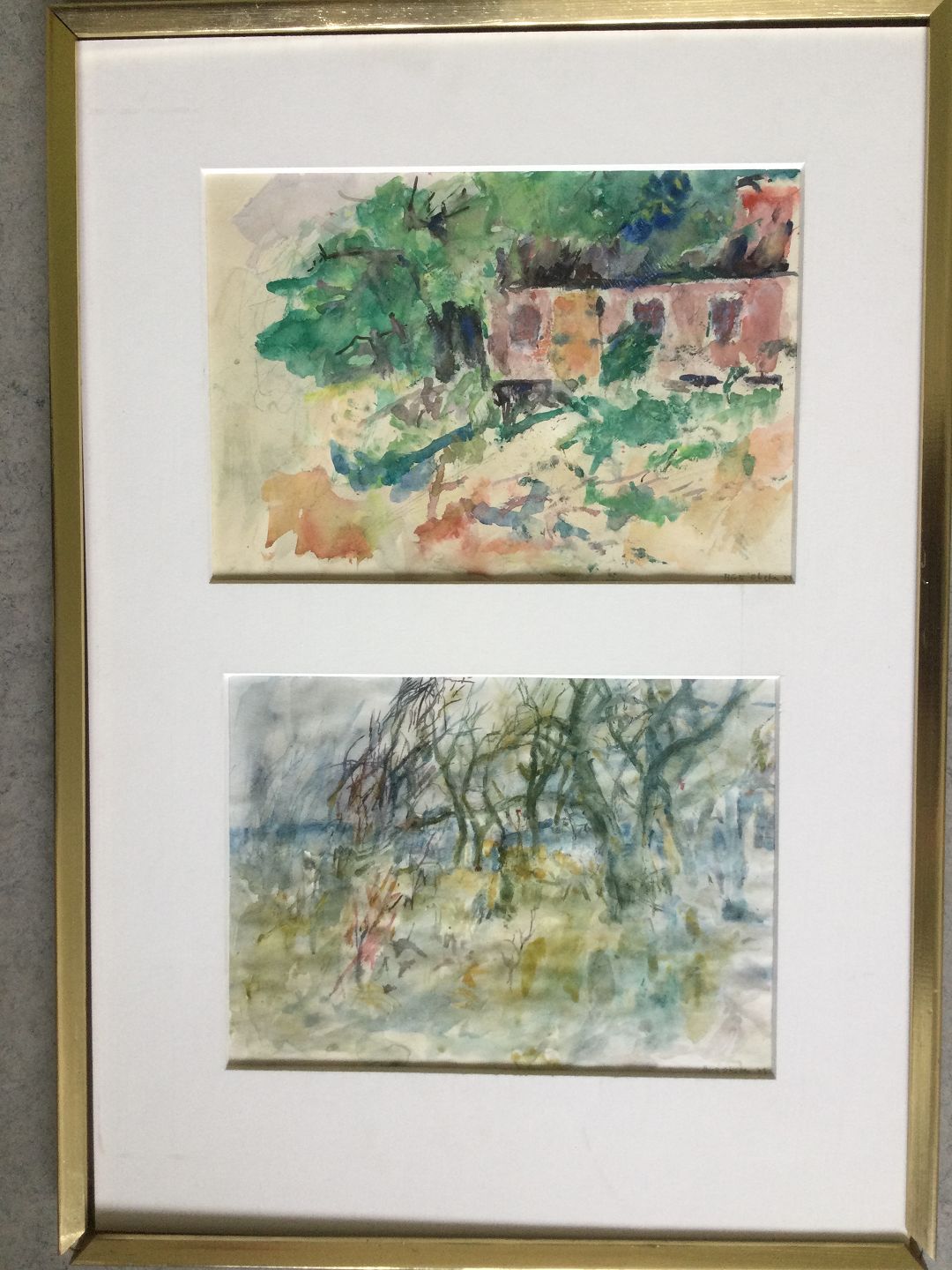 2 akvareller indrammet med passepartout i samme ramme uden glas.