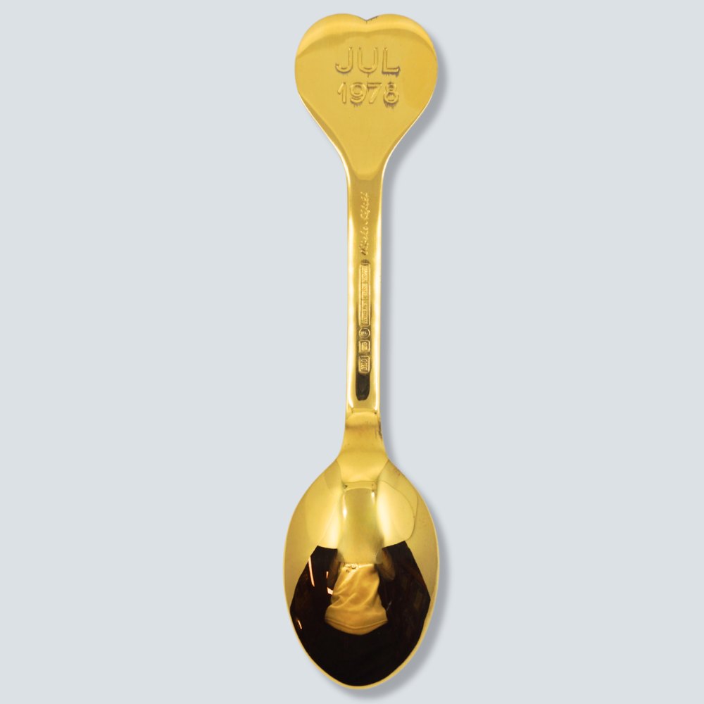 Vibeke Alfelt for Anton Michelsen; A christmas spoon 1978. Spoon of gilt sterling silver with enamel. Designed by Vibeke Alfelt, b. 1934, d. 1999. Danish design silver.