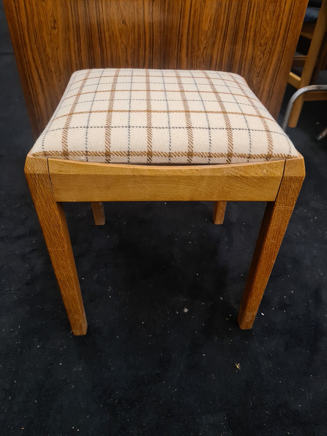 Taburet fra 1970´erne i eg med uldpolstring. Fremstår pæn og velholdt uden nævneværdige brugsspor.