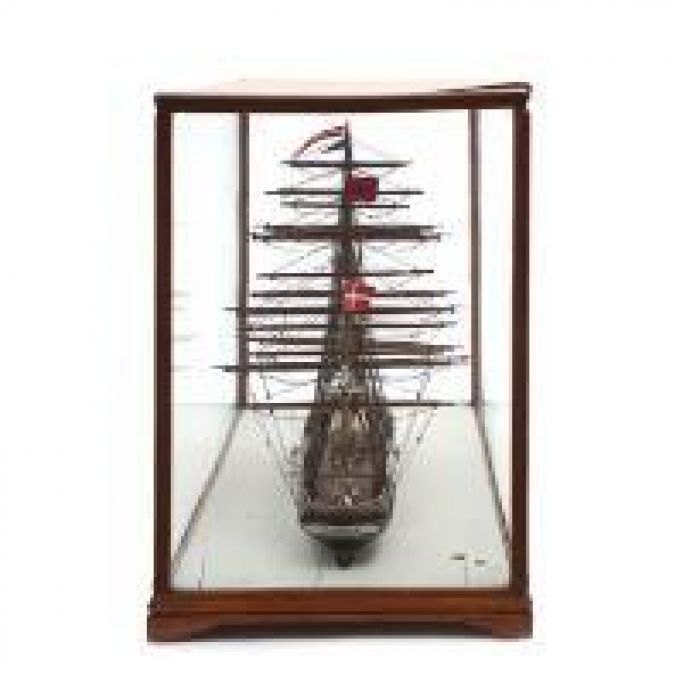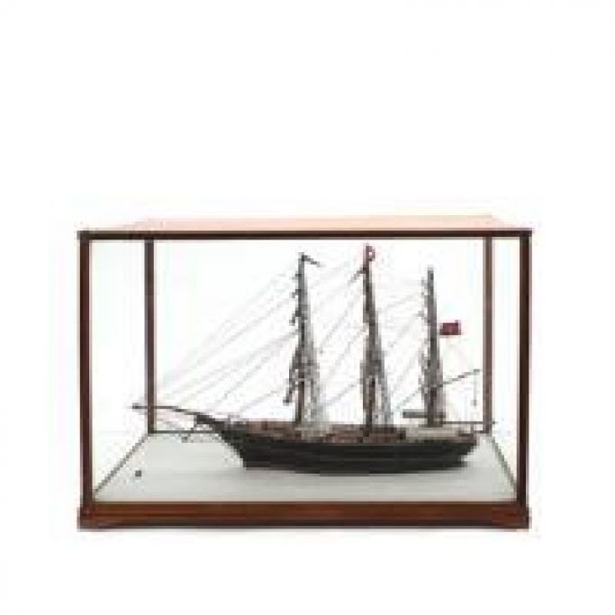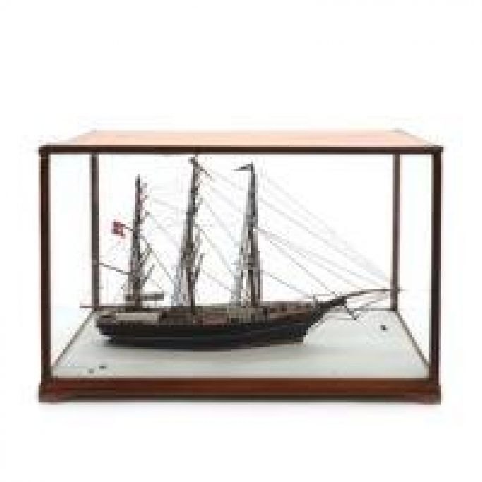 Three-masted model ship "Signe" made of partially painted wood. In a wooden display case with glass sides. middle of the 20th century. Denmark. Hand built. Display H. 45. L. 63. B. 31.