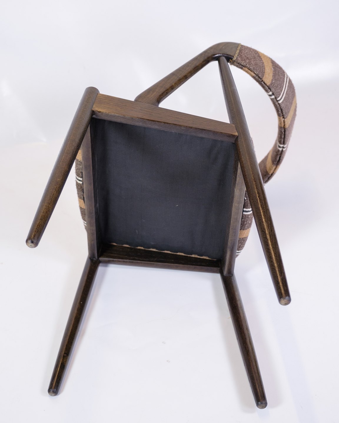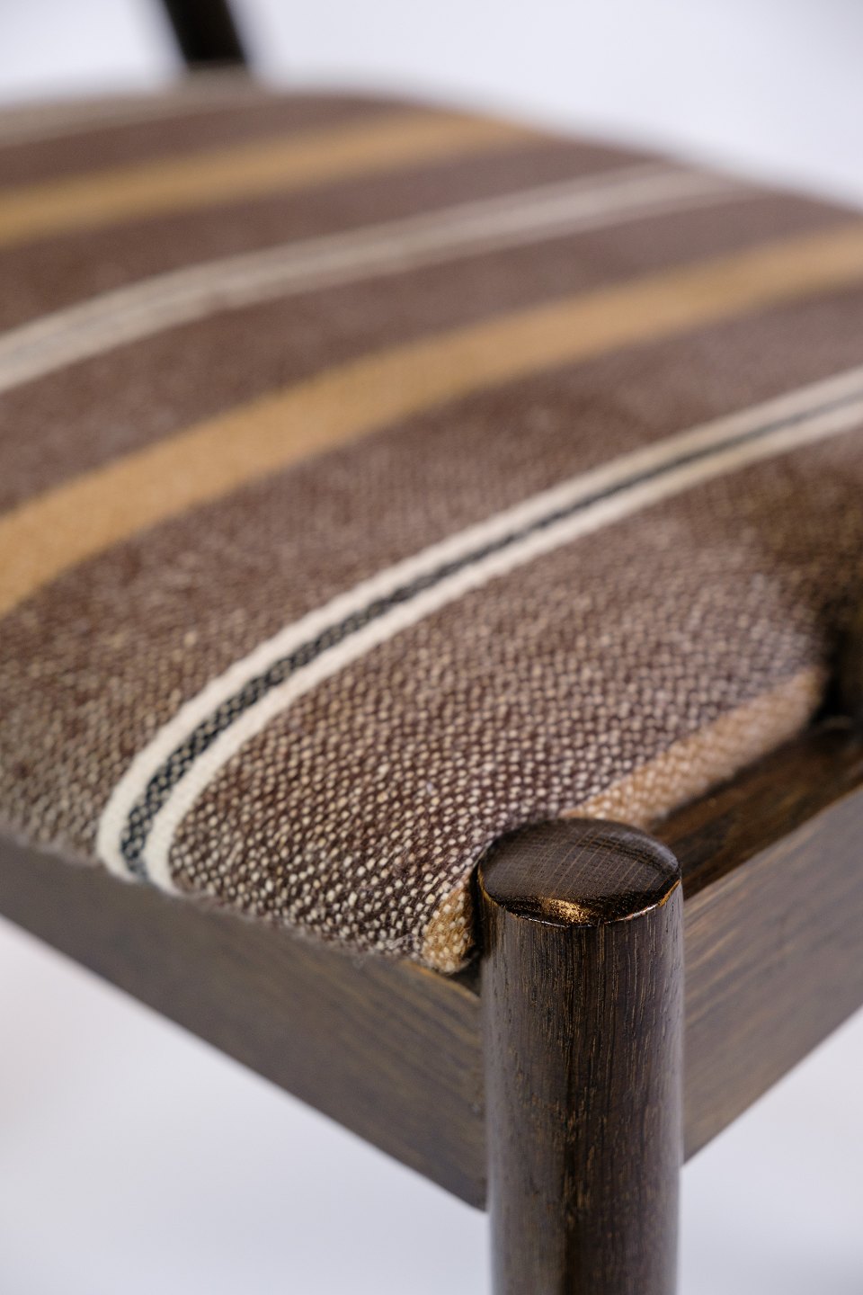 The striped fabric cover adds a visually interesting element to the chairs. The fabric's pattern and colors create a nice contrast to the dark oak, which gives the chairs a fresh and modern look that still feels classic and timeless.